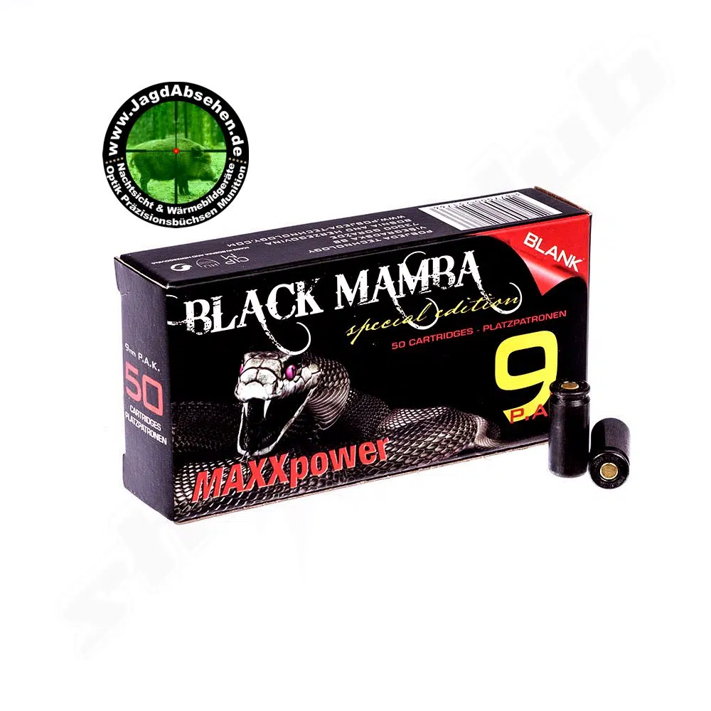 9mm PAK MAXXpower Black Mamba 9mm Knall: Die uns als am heftigsten bekannte Munition am Markt – neue Ladung, noch lauter (Kundenbericht!)! Qualitäts-Knallpatronen für die Signalgebung und zum Verschießen von Signaleffekten 15mm aus Gas/Signalwaffen. Diese Munition passt in halbautomatische 9mm-Schreckschusspistolen mit Magazin. Bei diesen MAXXpower Black Mamba 9mm Knall Platzpatronen im Kaliber 9mm P.A.Knall handelt es sich um die Black Mamba in einer Special Edition mit schwarzer Stahlhülse.