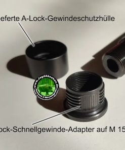 So kann man seinen Schalldämpfer mittels Adapter mit einer schnellen Drehung um 60° in weniger als einer Sekunde befestigen oder demontieren. Außerdem ermöglicht es die Nutzung EINES H2 Schalldämpfers auf MEHREREN kalibergleichen Waffen. Weitere Vorteile des A-Lock: das Gewinde des Laufes wird vor ständigem Auf- und Abschrauben verschont und das Schnellgewinde des A-Lock ist weniger empfindlich gegen Schmutz oder Flusen. Das sehr robuste Design hält fester und besitzt längere Standzeiten als ein konventionelles Gewinde.