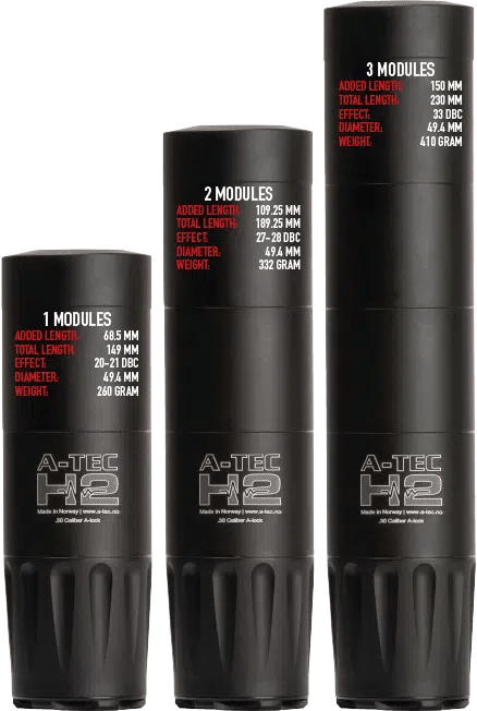 • A-TEC mit Schnellwechselsystem Modular aufgebauter Aluminium-Schalldämpfer mit Alu/Stahlkern (Erste Hauptlamelle ist aus Edelstahl gefertigt)