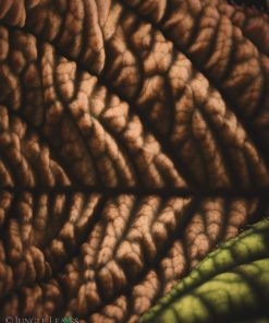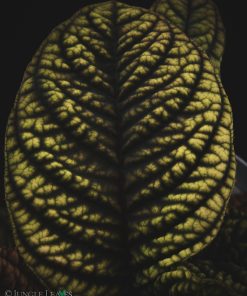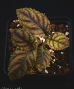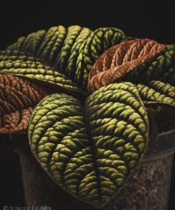 Sie hat bis etwa 22 cm lange Blätter mit einer sehr auffälligen Struktur und Zeichnung. Die Blattadern sind dunkel, bei älteren Pflanzen schwarz, die Blattfläche zwischen diesen Adern ist aufgewölbt (bullat) und meist bräunlich, oder rötlich mit einem samtigen, metallischen Glanz der sich auf Bildern nur schwer einfangen lässt. Die Blätter sind je nach Lichtintensität unterschiedlich gefärbt. Bei viel Licht werden sie eher grünlich. Frische Blätter sind immer rötlich gefärbt. Wir vermuten, dass diese Färbung auf dem Waldboden als Tarnung dient und die Pflanze so im Fallaub kaum zu erkennen ist.