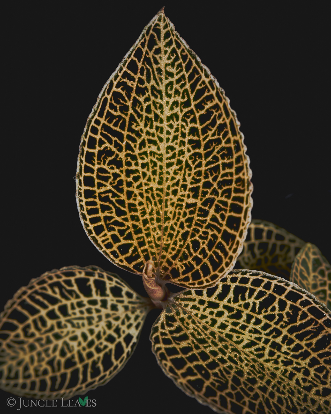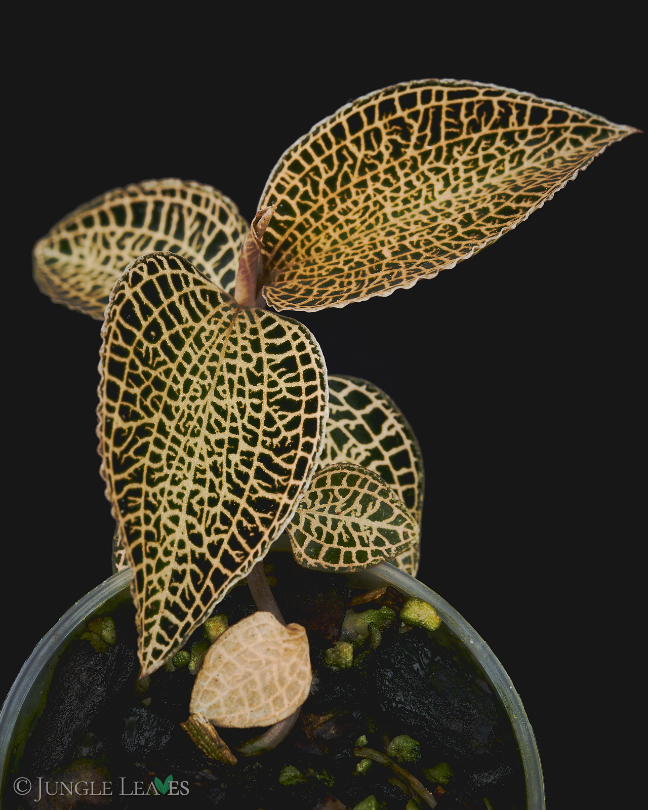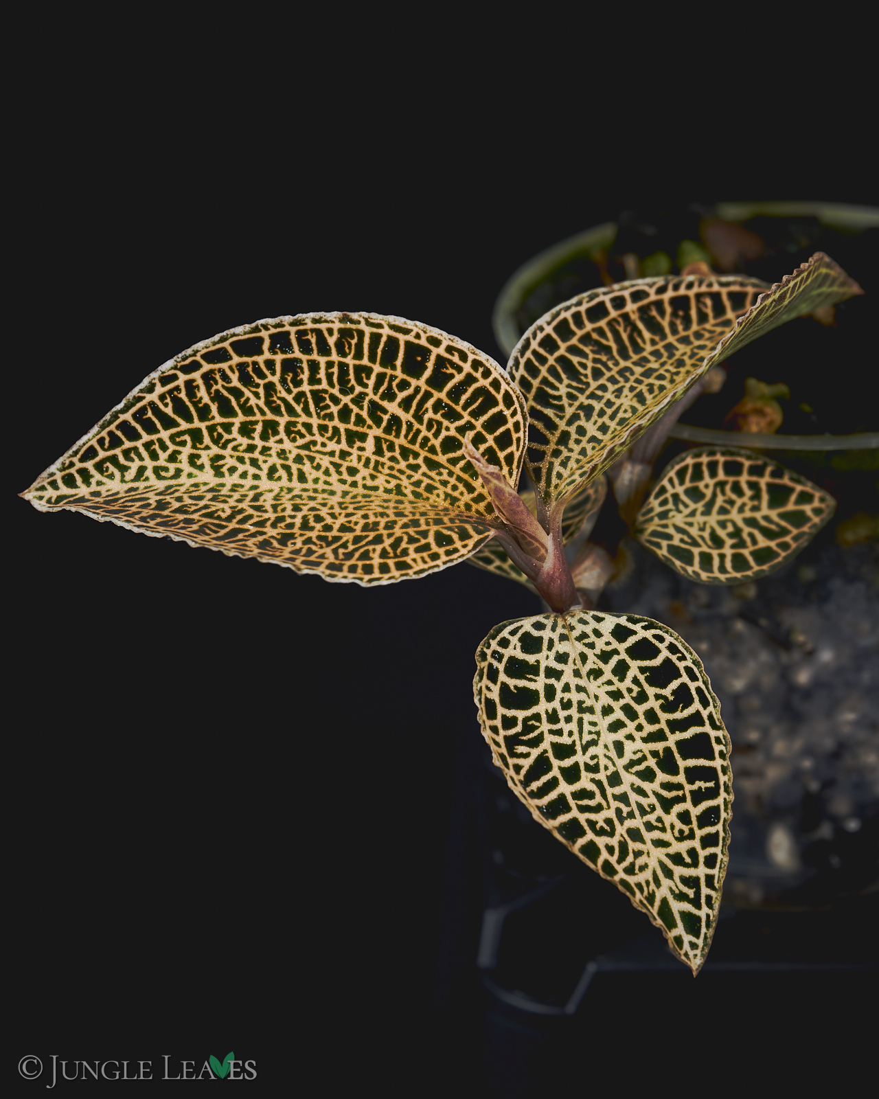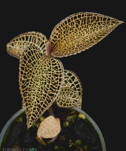 Anoectochilus roxburghii ist eine kleine Juwelorchidee und kommt von Südchina und Indochina bis nach Thailand vor. Sie wächst dort an sehr schattigen Stellen, meist direkt auf feuchten Steinen (lithophytisch). Sie wird (ohne Blütenstiel) nur etwa 5 bis 10 cm hoch, mit 3 bis 5 cm großen Blättern. Die Art ist sehr variabel gemustert. Die Blätter haben eine dunkelgrüne, manchmal sogar fast schwarze grundfarbe und goldene bis rötliche, stark glitzernde Blattadern. Die Form, die wir hier anbieten zeichnet sich durch ein besonders feinmaschiges, goldenes Netzmuster auf den Blättern aus.