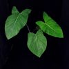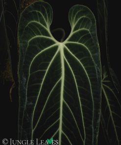 Die Blätter werden etwa 100 bis 120cm lang und 20 bis 40cm breit. Sie werden hängend getragen und sind dunkelgrün bis fast schwarz, mit kontrastreichen, weiß abgesetzten Blattadern. Das Blatt hat eine samtige, matte Erscheinung. Das ist typische für Pflanzen, die an Schwachlicht angepasst sind. Die Zellen der Epidermis haben eine verdickte, gewölbte Cuticula, die wie eine Mirkolinse funktioniert und das schwache, diffuse Licht im Lebensraum der Pflanze auf die Chloroplasten bündelt. Millionen dieser Linsen überziehen die Blattoberseite und geben dem Blatt das typische samtige Aussehen.