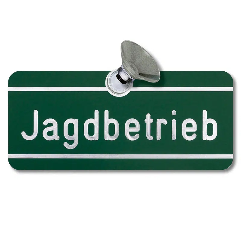 Ärgerlich. Da bist Du als Treiber oder Jäger eingeladen zum Kesseltreiben nach der Drückjagd, stellst das Auto auf dem Feldweg ab, kommst nach 3 Stunden glücklich und satt wieder an das Fahrzeug – und ein Strafzettel hängt daran wegen unerlaubten Befahrens des Feldweges. Hätte die Streife einen ordentlichen Hinweis gefunden, hätte es sicherlich keine Komplikationen dieser Art gegeben. Und genau dafür haben wir unsere Jagdbetrieb-Schilder! Auch nicht jeder forsche Wanderer, der sich in der Waldesruh gestört fühlt zückt nicht gleich das Handy zum Notruf, wenn er solch ein erklärendes Schild sieht im vorbeifahrenden Geländewagen (eines vorne und eines hinten kein Fehler!). Die Schilder sind keine billigen, UV-empfindlichen Plastiktafeln, sondern extrem hochqualitativ gefertigt aus grün-eloxiertem Aluminium, die eingravierte Schrift ist metallisch glänzend und sehr gut sichtbar. In den Saugnapf ist ein extrem starker Magnet eingeschraubt. Das Schild kann also bequem abgenommen und wieder angeklickt werden, der Sauger verbleibt dauerhaft an der Windschutzscheibe. Wer lieber ein Schild mit Wappen haben möchte, hier klicken!