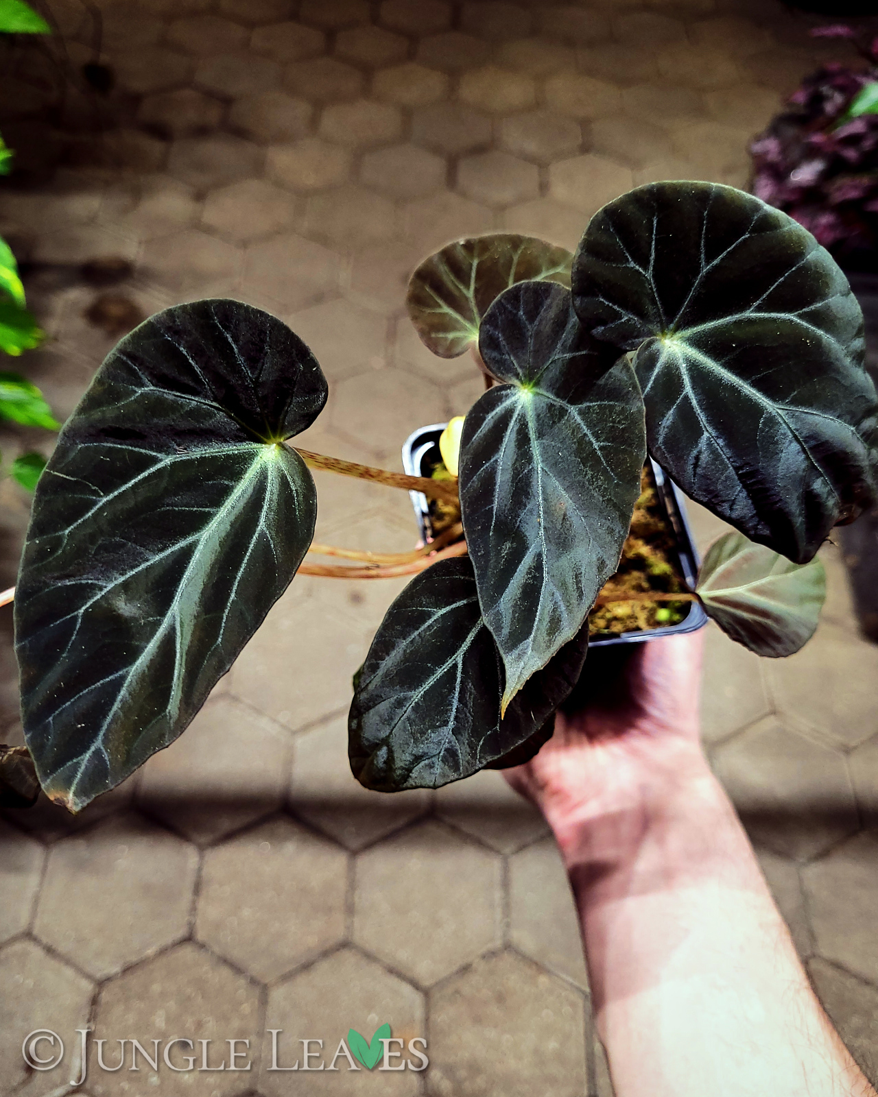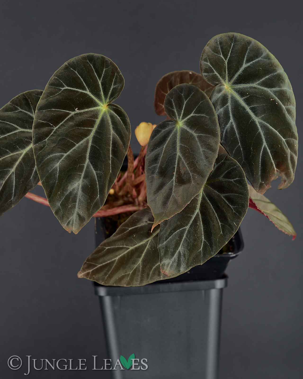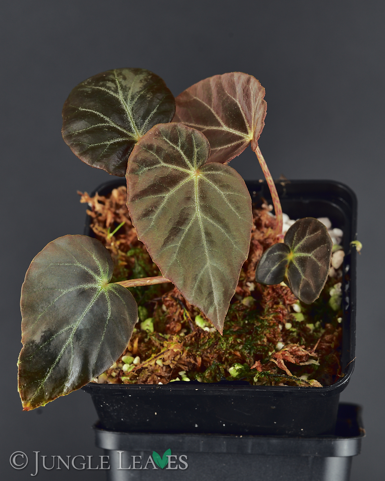 Die Blattzeichnung der Art ist ziemlich variabel, und in der Natur wachsen sehr unterschiedlich aussehende Individuen in derselben Population direkt nebeneinander. Bei der „Dark Form“ handelt es sich um einen Einzelklon mit festgelegtem Muster. Die Blätter sind komplett samtig und sehr dunkel, fast schwarz mit fein abgesetzten silbernen Blattvenen. Sie zeigen eine sehr starke Irideszenz. Aber nicht nur die Blätter sind bei dieser Form schön, auch die Blattstiele zeigen ein kontrastreiches Streifenmuster. Die Blüten sind ebenfalls hübsch anzusehen, sie sind hellrosa und für eine Begonie ziemlich groß.