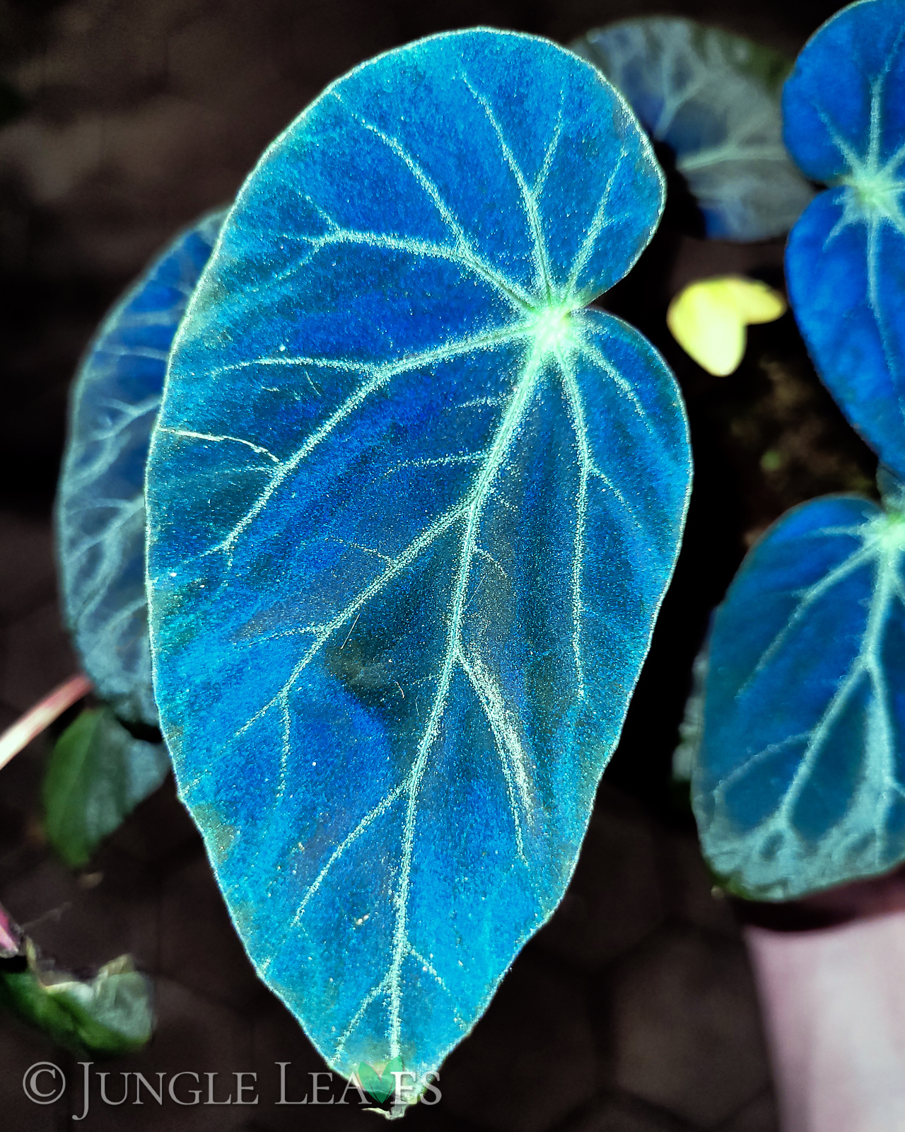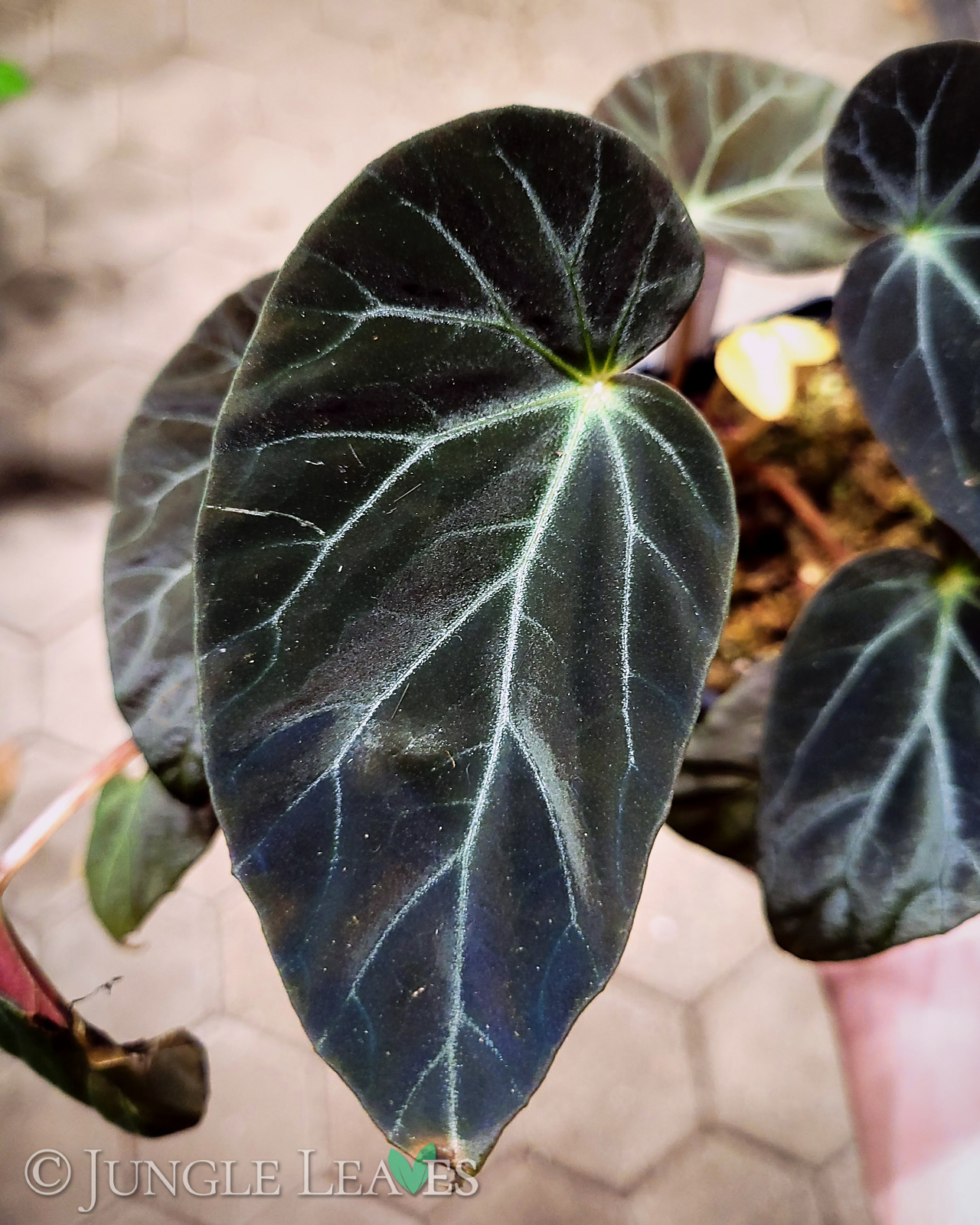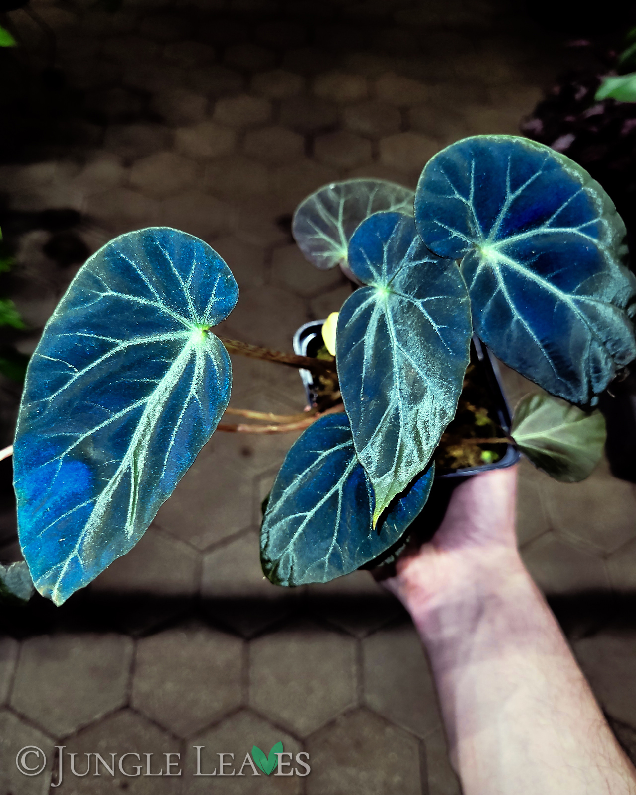 Die Blattzeichnung der Art ist ziemlich variabel, und in der Natur wachsen sehr unterschiedlich aussehende Individuen in derselben Population direkt nebeneinander. Bei der „Dark Form“ handelt es sich um einen Einzelklon mit festgelegtem Muster. Die Blätter sind komplett samtig und sehr dunkel, fast schwarz mit fein abgesetzten silbernen Blattvenen. Sie zeigen eine sehr starke Irideszenz. Aber nicht nur die Blätter sind bei dieser Form schön, auch die Blattstiele zeigen ein kontrastreiches Streifenmuster. Die Blüten sind ebenfalls hübsch anzusehen, sie sind hellrosa und für eine Begonie ziemlich groß.