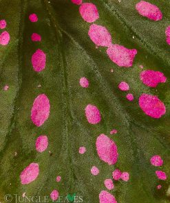 Die oliv- bis dunkelgrünen Blätter sind samtig, matt und auffällig gewellt und wirken dadurch sehr dreidimensional. Ihr auffälligstes Merkmal sind natürlich die knallig pinken Punkte, welche geradezu zu leuchten scheinen. Bei genauer Betrachtung glitzern die Punkte sogar im Licht, als wären sie aus Metalllack. Die Blätter werden meist nur etwa 6 bis 8 cm lang und 4 cm breit. Junge Blätter sind olivgrün und dunkeln mit der Zeit ab. Ein wenig sieht Begonia cf. negrosensis aus wie eine pinke Miniversion der beliebten Forellenbegonie (Begonia maculata). Ältere Pflanzen von Begonia cf. negrosensis tendieren dazu, etwas weniger stark gepunktet zu sein. Man kann diese aber einfach zurückschneiden und neu austreiben lassen. Der Neuaustrieb wird dann wieder knallig pink gemustert sein.