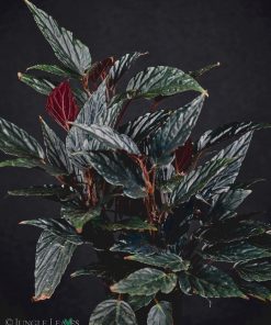 Sie wächst mit fast senkrecht stehenden, zugespizten Blättern an einem aufrecht stehenden Rhizom. Die Unterseiten der Blätter sind tiefrot mit gelblichen Blattadern. Durch den fast senkrechten Wuchs kommen sie besonders schön zur Geltung. Die Blätter werden auf kurzen und sehr fein, aber dicht behaarten festen Stielen getragen, welche aus einem kriechenden Rhizom wachsen. Dabei bleibt die gesamte Wuchsform sehr kompakt. Die Blätter werden bis etwa 12 cm lang.