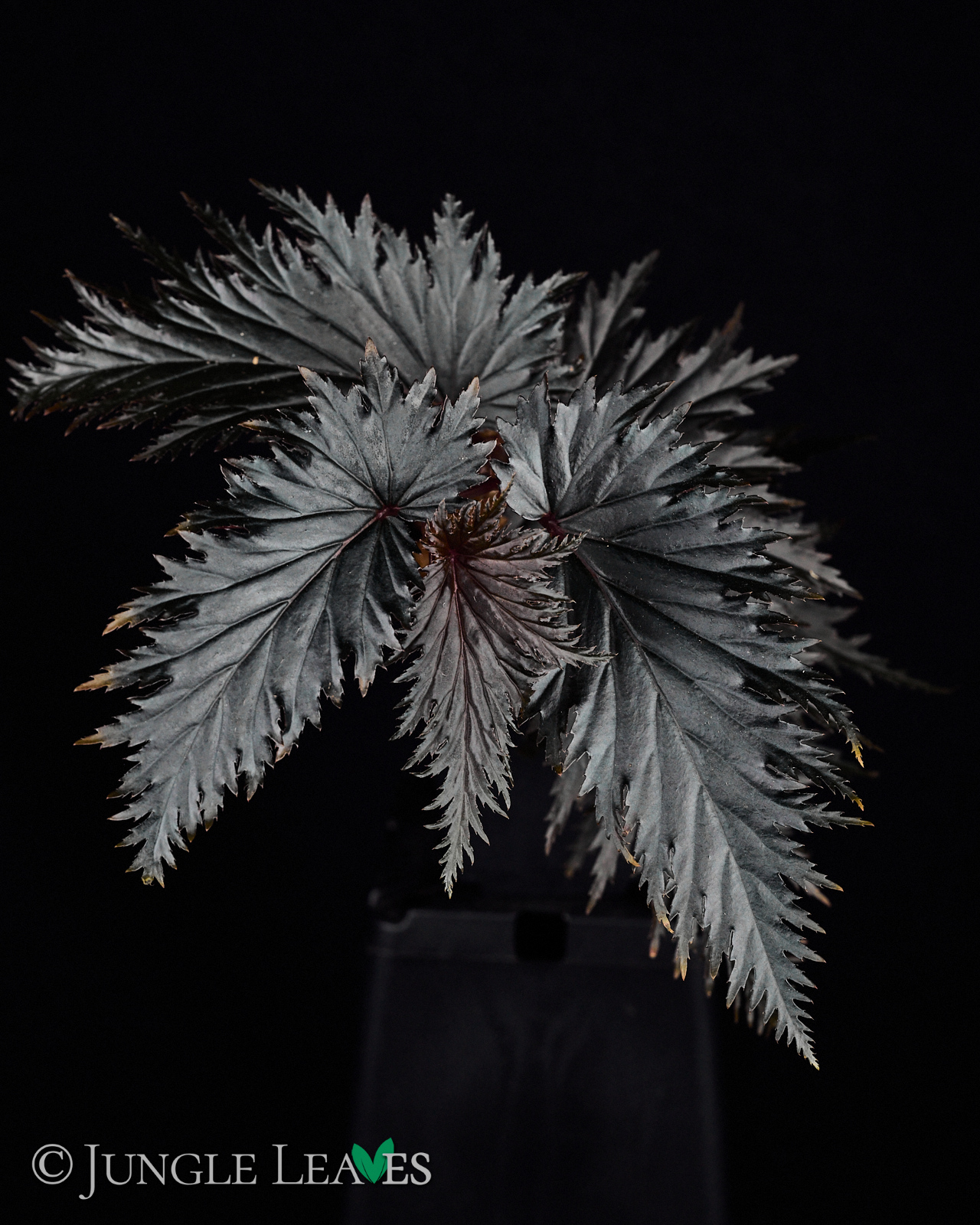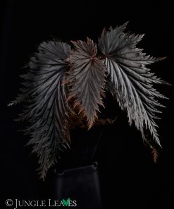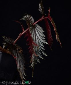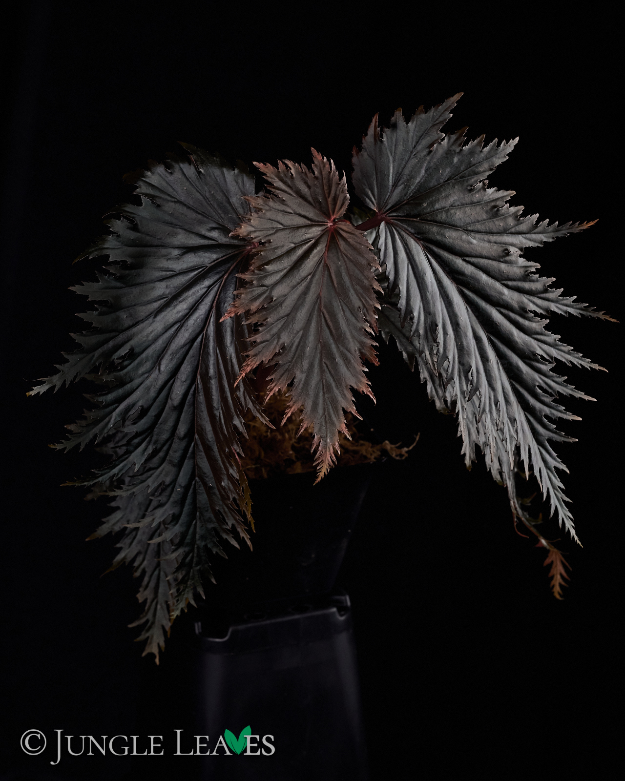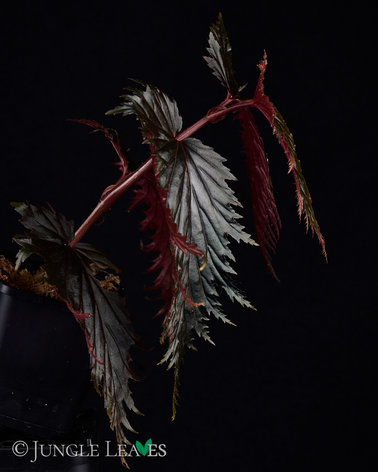 Begonia sp. ‚Miri‘ hat bis zu 23cm lange und 11cm breite Blätter mit einem tiefroten bis schwarzen Grundton und starkem, metallischem Glanz. Die Blattränder sind doppelt gezahnt und wirken wie „ausgefranst“. Die Blattunterseiten und Stämme sind rot. Sie wächst zunächst aufrecht, später kriechend und wird etwa 40cm hoch.