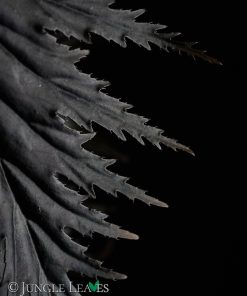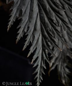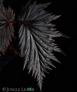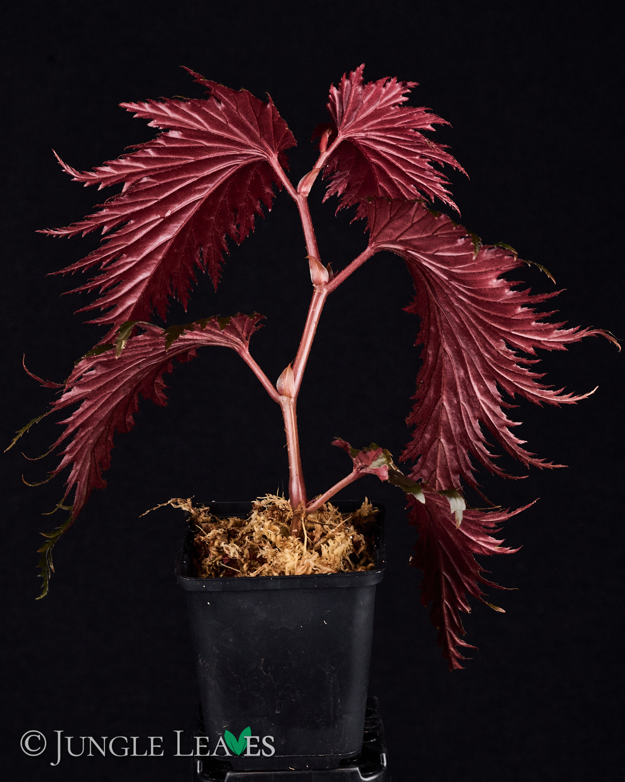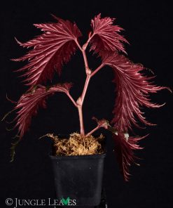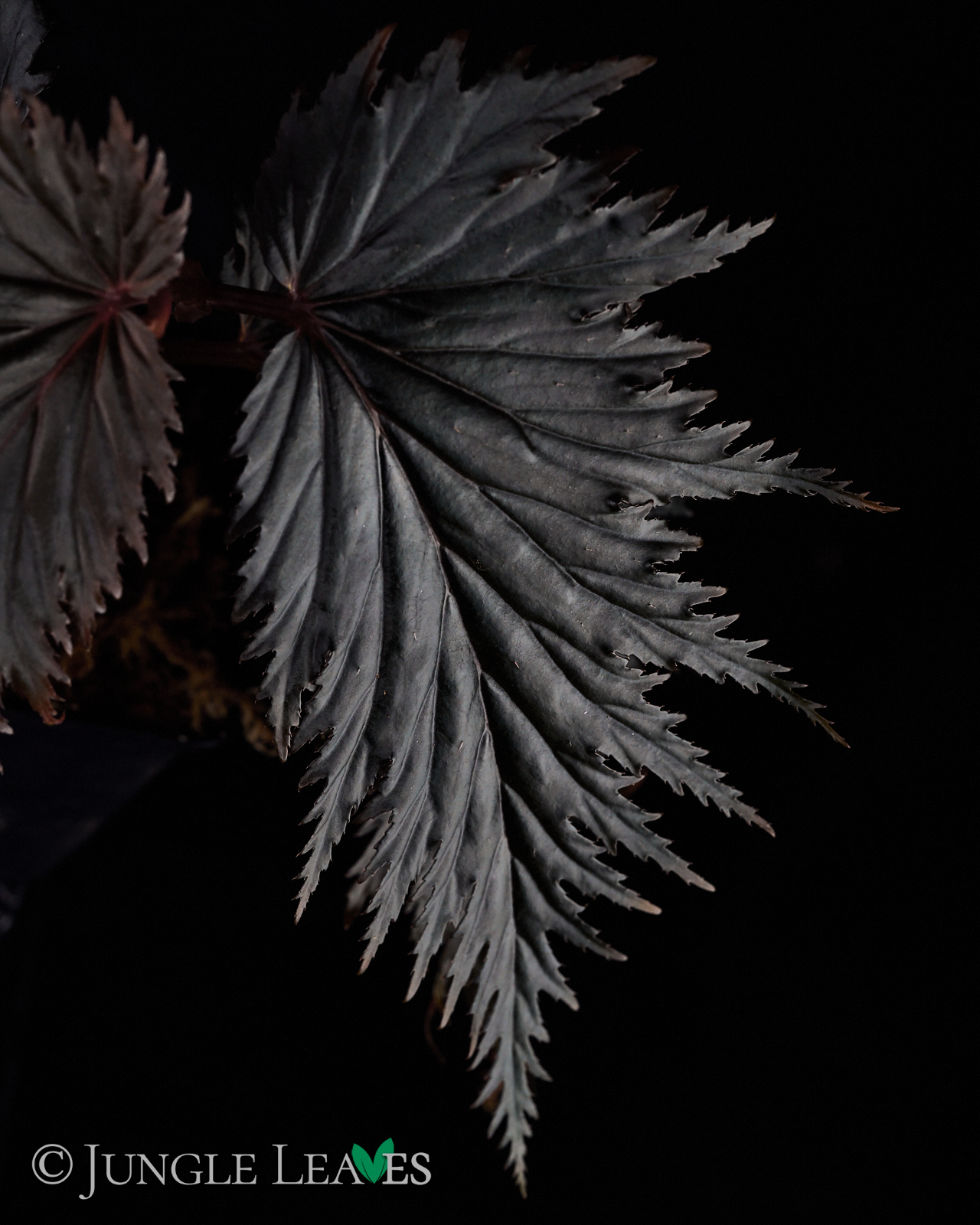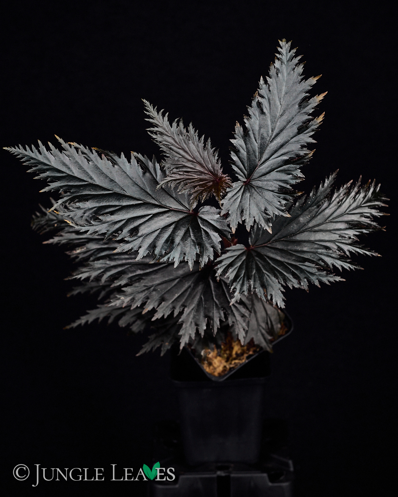 Begonia sp. ‚Miri‘ hat bis zu 23cm lange und 11cm breite Blätter mit einem tiefroten bis schwarzen Grundton und starkem, metallischem Glanz. Die Blattränder sind doppelt gezahnt und wirken wie „ausgefranst“. Die Blattunterseiten und Stämme sind rot. Sie wächst zunächst aufrecht, später kriechend und wird etwa 40cm hoch.