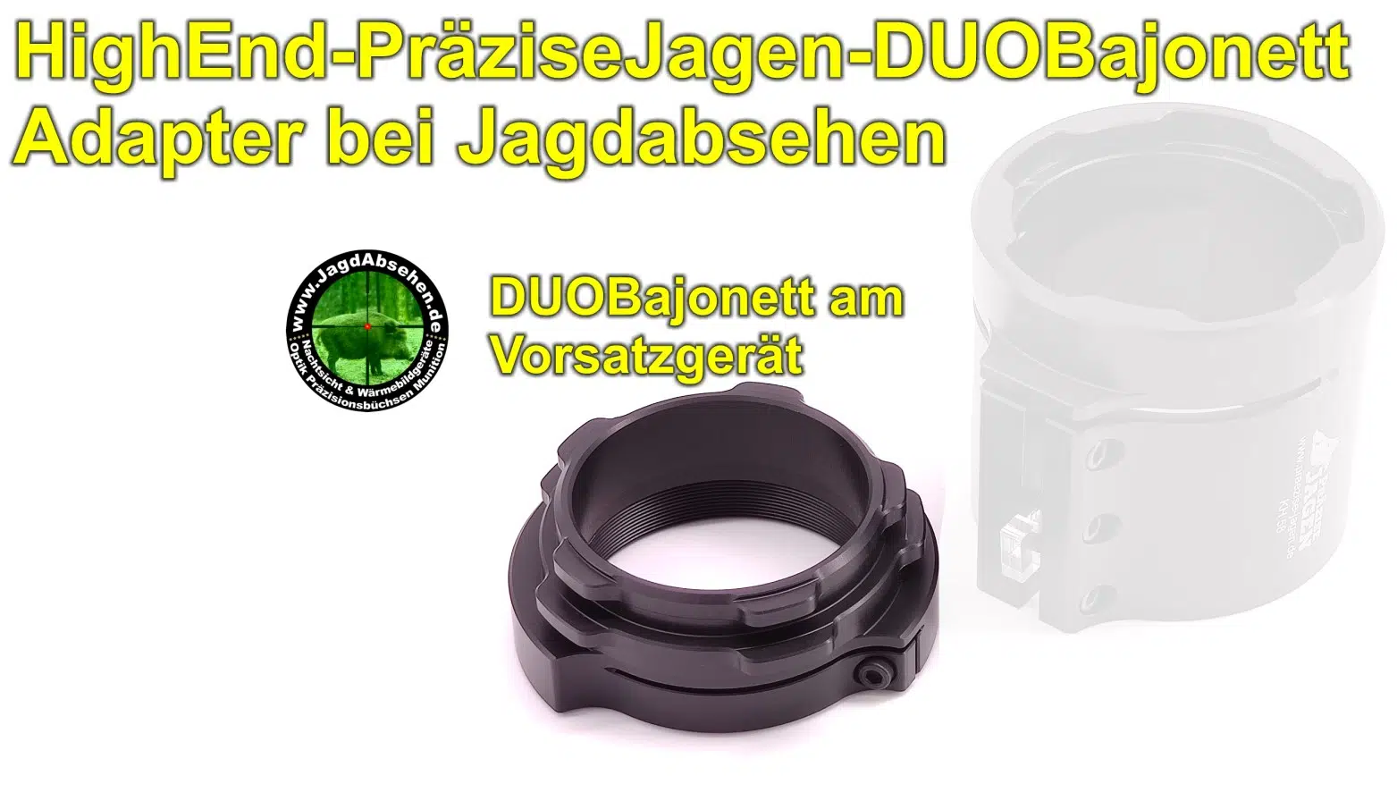 Der Duoverbinder PräziseJagen Vorsatzgeräte wird auf das Gewinde des Vorsatzgerätes geschraubt und verbleibt dort. Es passt genau in das Gegenstück, dass sich auf dem/den Zielfernrohr(en) befindet!
