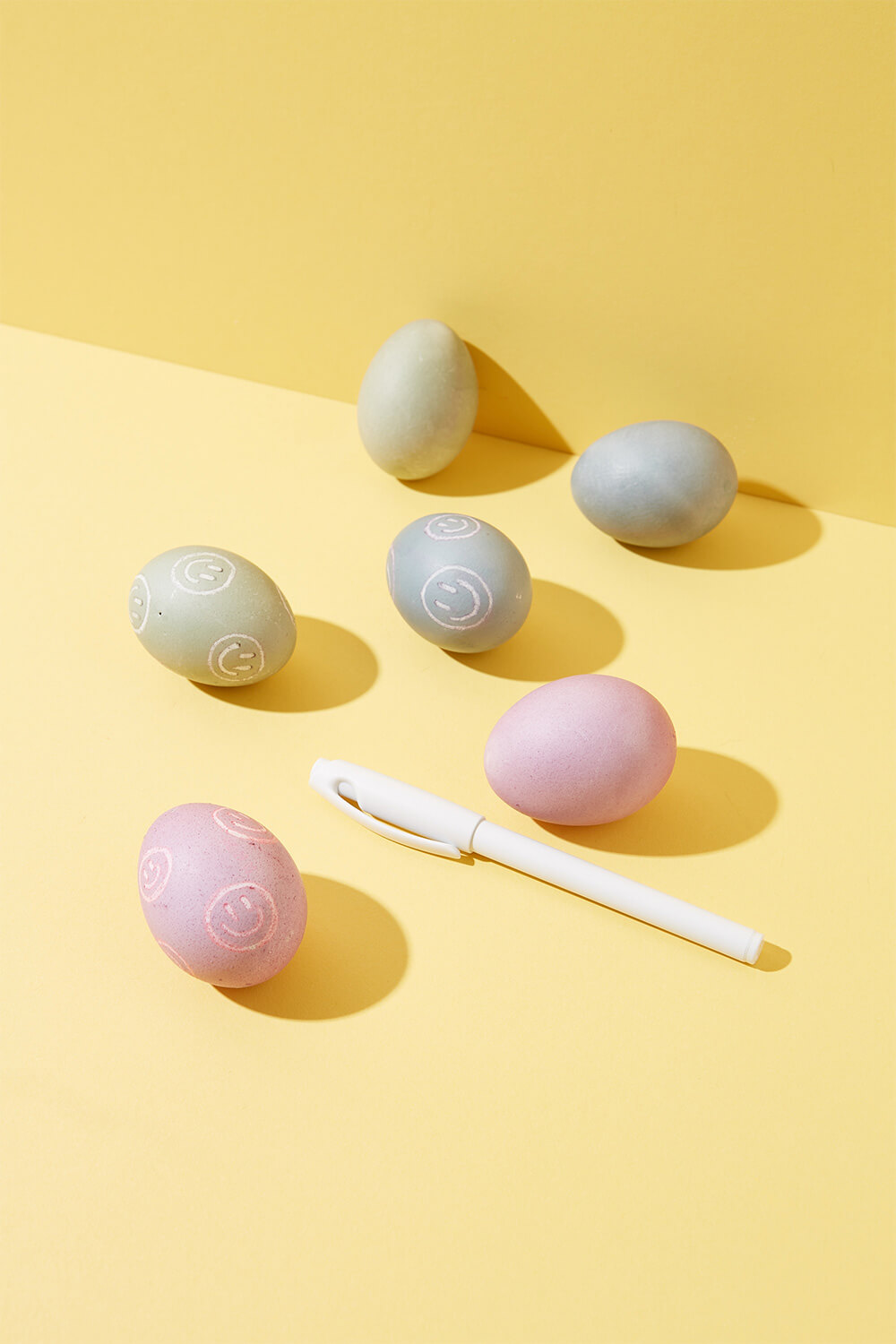 Der Stift löscht durch leichtes Reiben die Farbe und schon erscheint die Eierschale an diesen Stellen. Da kommt gute Laune auf – nicht nur, wenn du wie wir Lachgesichter zauberst. Sei mutig und kreativ!