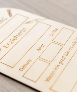 Denn auf der Erinnerungstafel aus Holz „Erster Tag“ könnt ihr selbst mit einem dafür geeigneten Stift die wichtigsten Daten und Informationen an diesem besonderen Tag eintragen. Hierfür habt ihr freie Flächen für den Namen der Schule oder des Kindergartens, für den Namen des Erziehers, der Erzieherin oder der Kindergartengruppe sowie Datum des besonderen Tages und Alter und Größe eures Kindes. Abgerundet wird dies noch durch das Feld des „Berufswunschs“ eures Kindes, wenn es dann mal erwachsen wird.