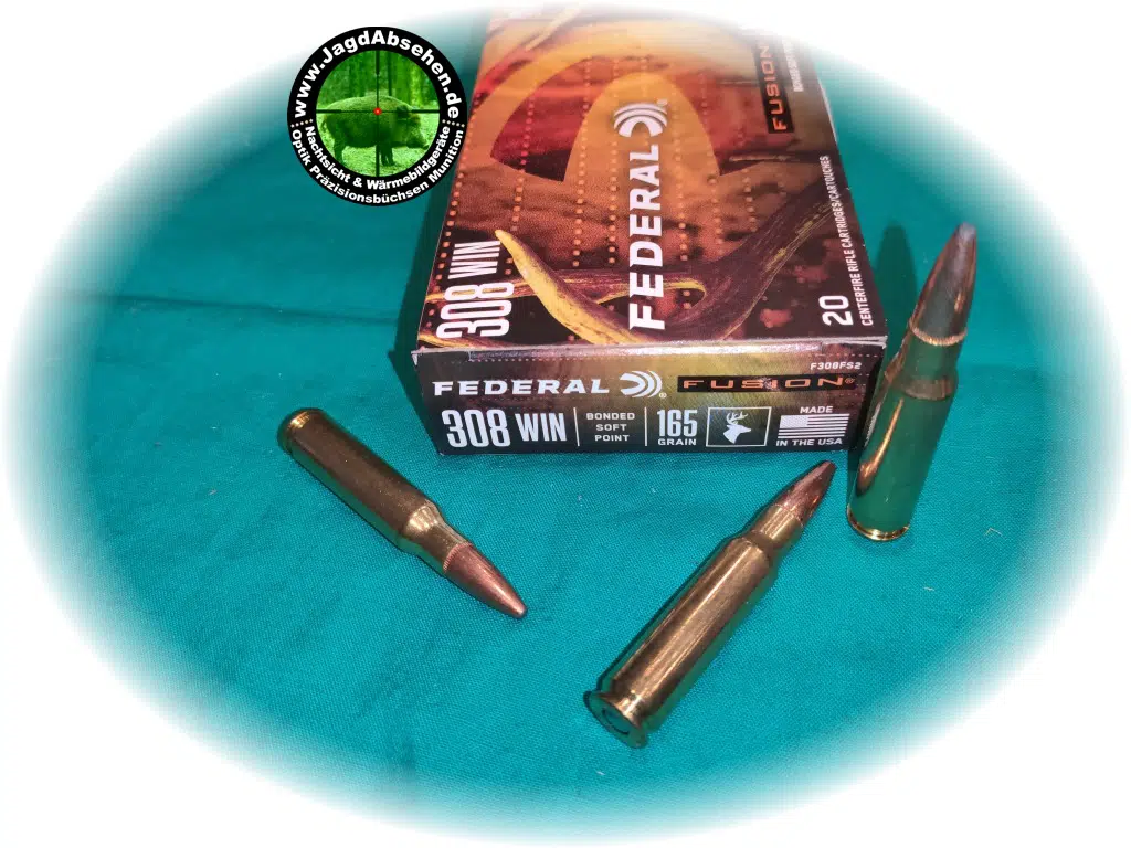 FEDERAL .308 WIN 165Grs FUSION , Innovation made in USA. Der elektrochemische „Fusion“-Prozess verbindet den Bleikern der FEDERAL .308 WIN 165Grs FUSION mit dem Mantel, und so hat FEDERAL erreicht, dass ein Abspalten des Bleikerns ausgeschlossen wird. Besonders gleichmäßiges Aufpilzen durch den bonded Softpoint, keine Splitter und die gewünschte hohe Energieabgabe des 165grs schweren Geschosses im Wildkörper sind die Markenzeichen der Fusion Patrone. Das formstabile Geschoss mit Boat-Tail ermöglicht eine gestreckte Flugbahn und sorgt für hervorragende Eigenpräzision. Enge Streukreise auf dem Schießstand und keine bis kurze Fluchtstrecken beweisen die hohe Qualität dieser Fusion-Munition.