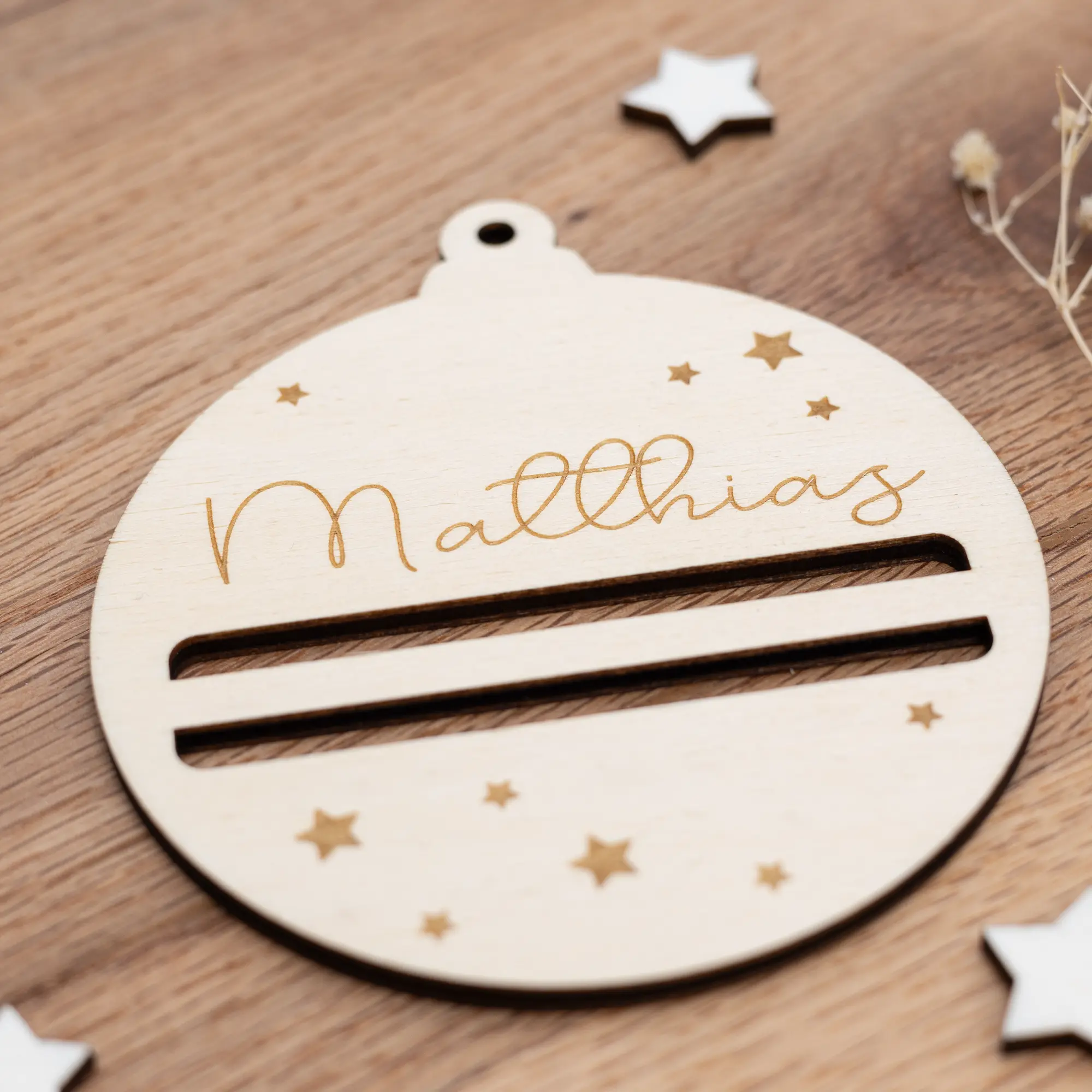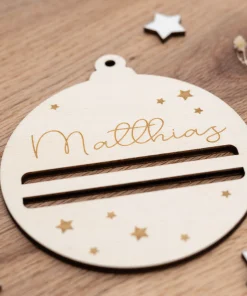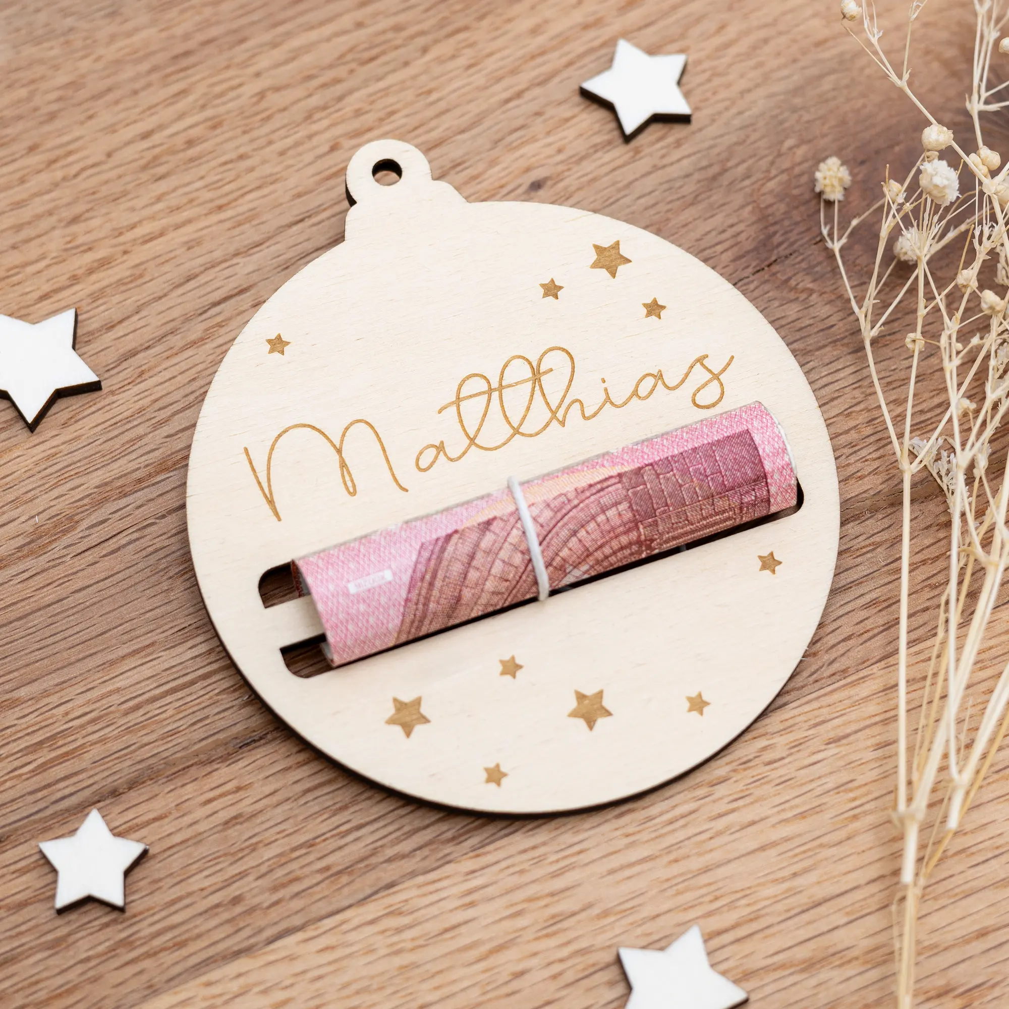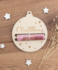 Unser hübscher Geldgeschenkanhänger – Christbaumkugel ist die perfekte Kombination auf Geschenkkarte und Weihnachtsschmuck. Durch zwei Schlitze lassen sich ganz einfach Geldscheine aufrollen, die Ihr dann zusätzlich zum Beispiel mit einer dekorativen Schleife verzieren könnt. Zusätzlich sind kleine Sterne in den Anhänger graviert und Ihr könnt einen Wunschnamen oder eure Weihnachtsgrüße auf den Geldgeschenkanhänger bringen. Das macht ihn nicht nur zu einer einfachen Geschenkkarte, sondern der Geldgeschenkanhänger lässt sich auch danach noch wunderbar als Weihnachtsschmuck an Gestecken, Fenstern oder am Weihnachtsbaum verwenden. So erhält der Beschenkte eine tolle Erinnerung an das gemeinsame Weihnachtsfest.
