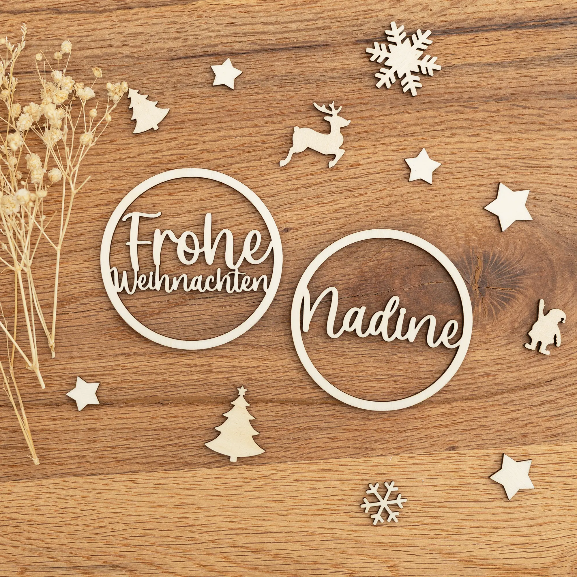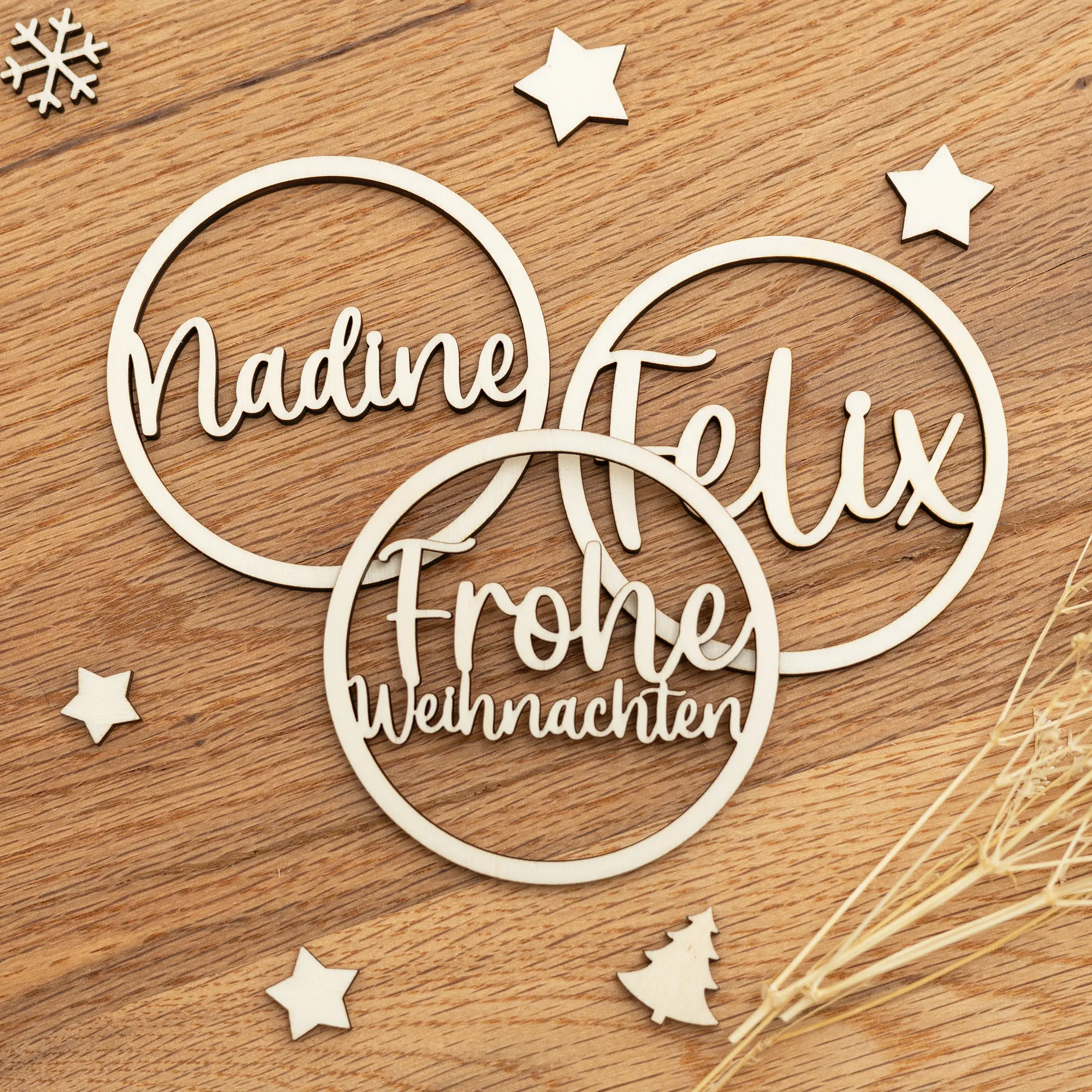 Nicht nur einzeln, sondern auch als Set könnt Ihr unsere Geschenkanhänger „Frohe Weihnachten“ erwerben. Dabei könnt Ihr wählen, ob Ihr den Frohe-Weihnachten-Anhänger oder den Namensanhänger einzeln bestellen oder ein individuelles Set zusammenstellen möchtet. So könnt Ihr gleich alle eure Weihnachtsgeschenke schmücken.