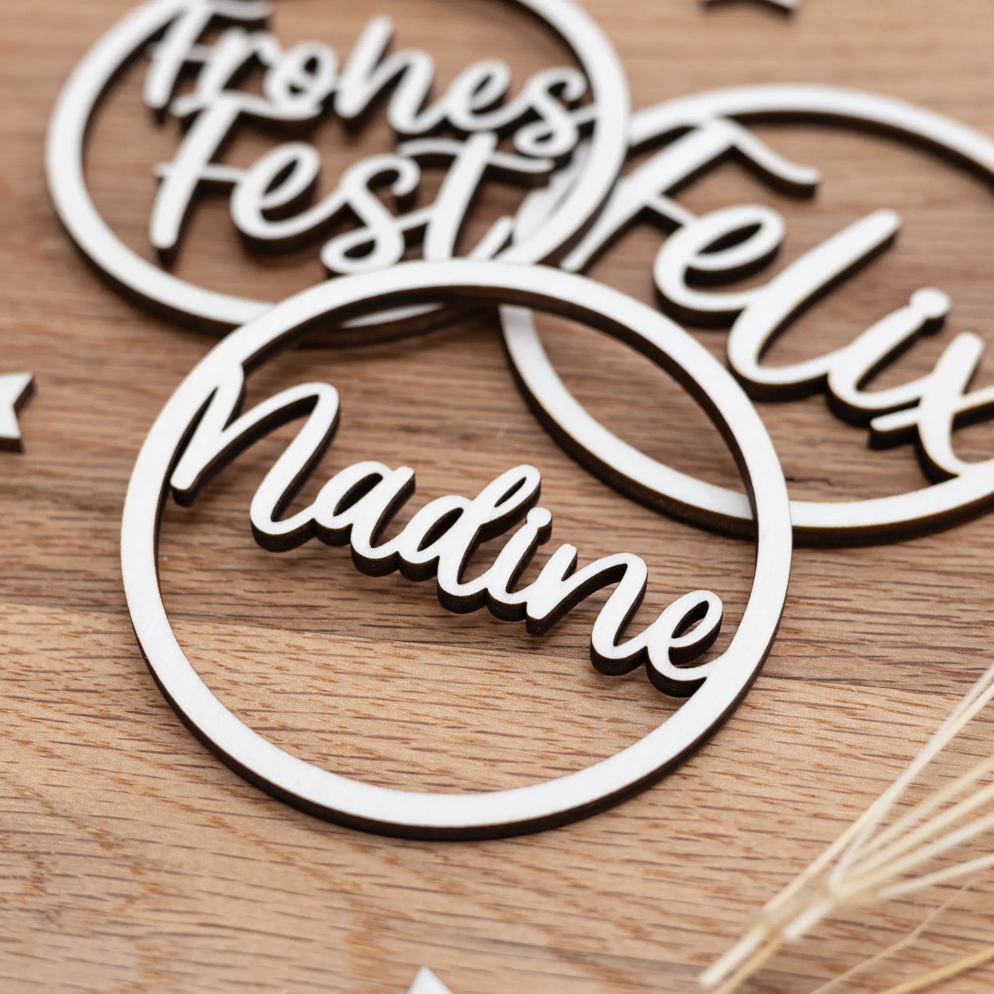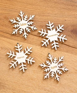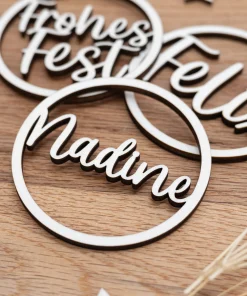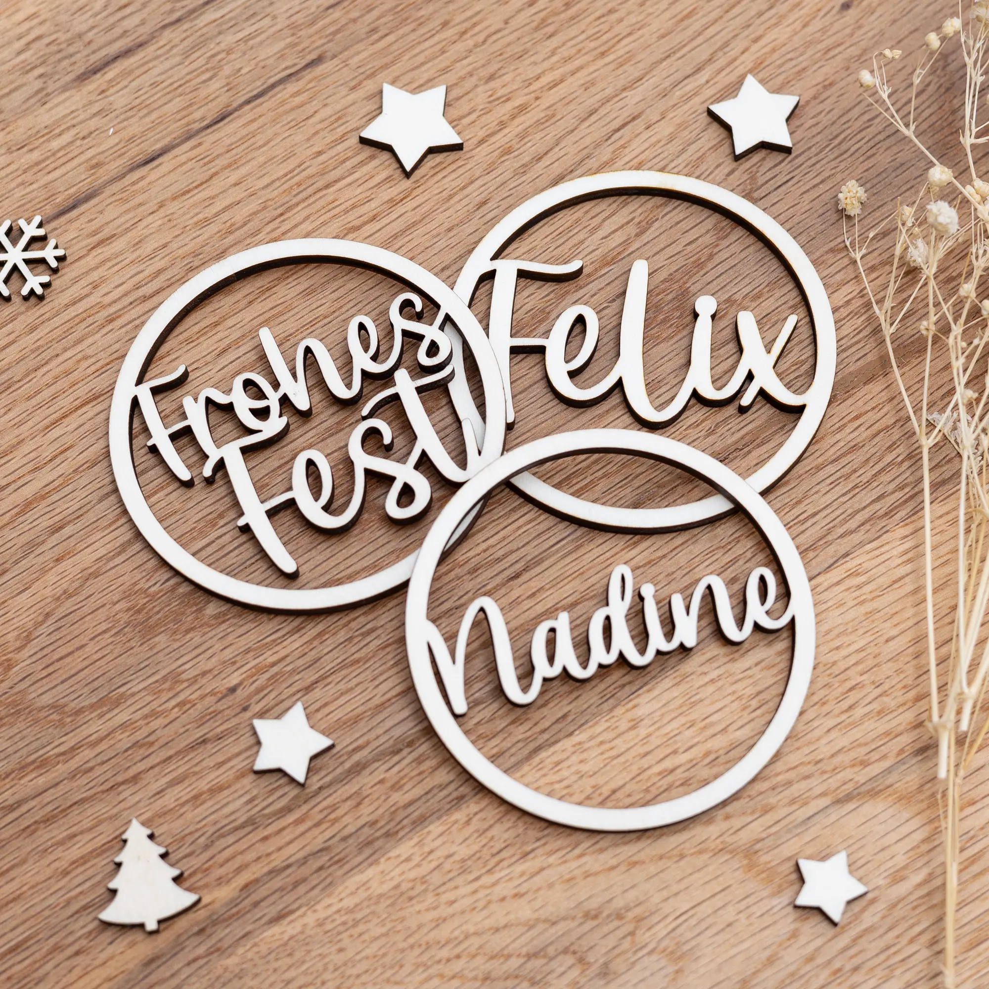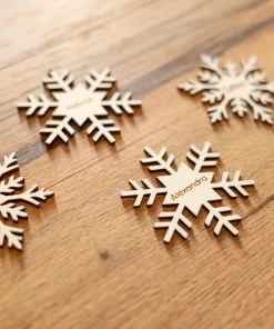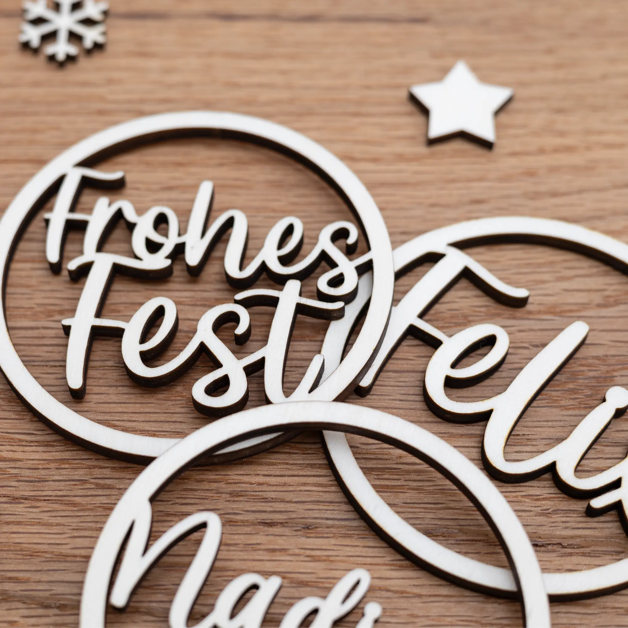 Die weihnachtlichen Anhänger und der Schriftzug werden per Laser in ihre Form geschnitten. Die dadurch entstehenden dunklen Seiten geben dem Weihnachtsschmuck eine schöne Kontur, sodass der Geschenkanhänger sich schön vom Geschenk abhebt.