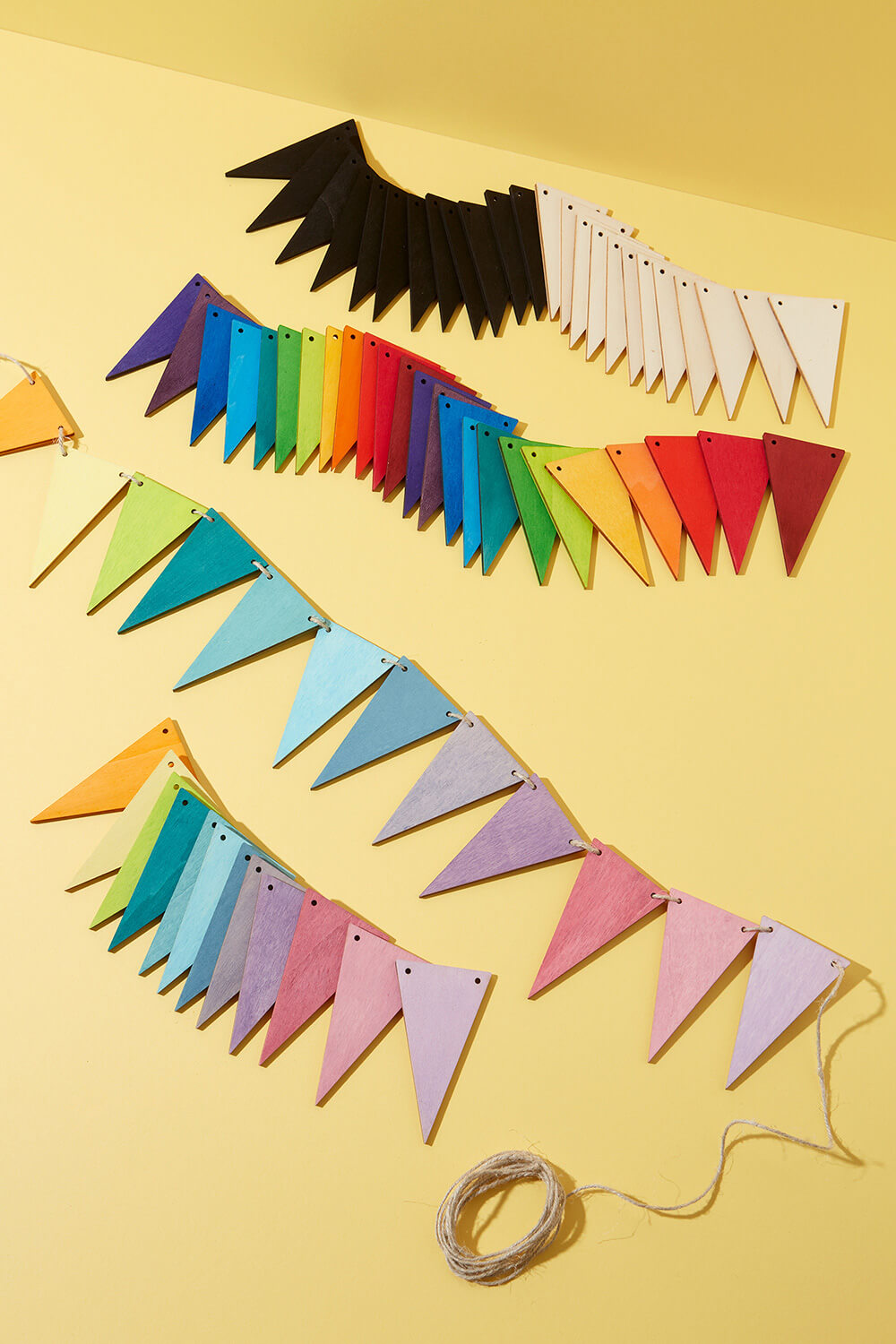Die farbig lasierten Wimpel aus Sperrholz sehen nicht nur super natürlich aus, sondern sind auch noch eine langlebige und nachhaltige Alternative. YAY, so macht das Feiern gleich doppelt Spaß!