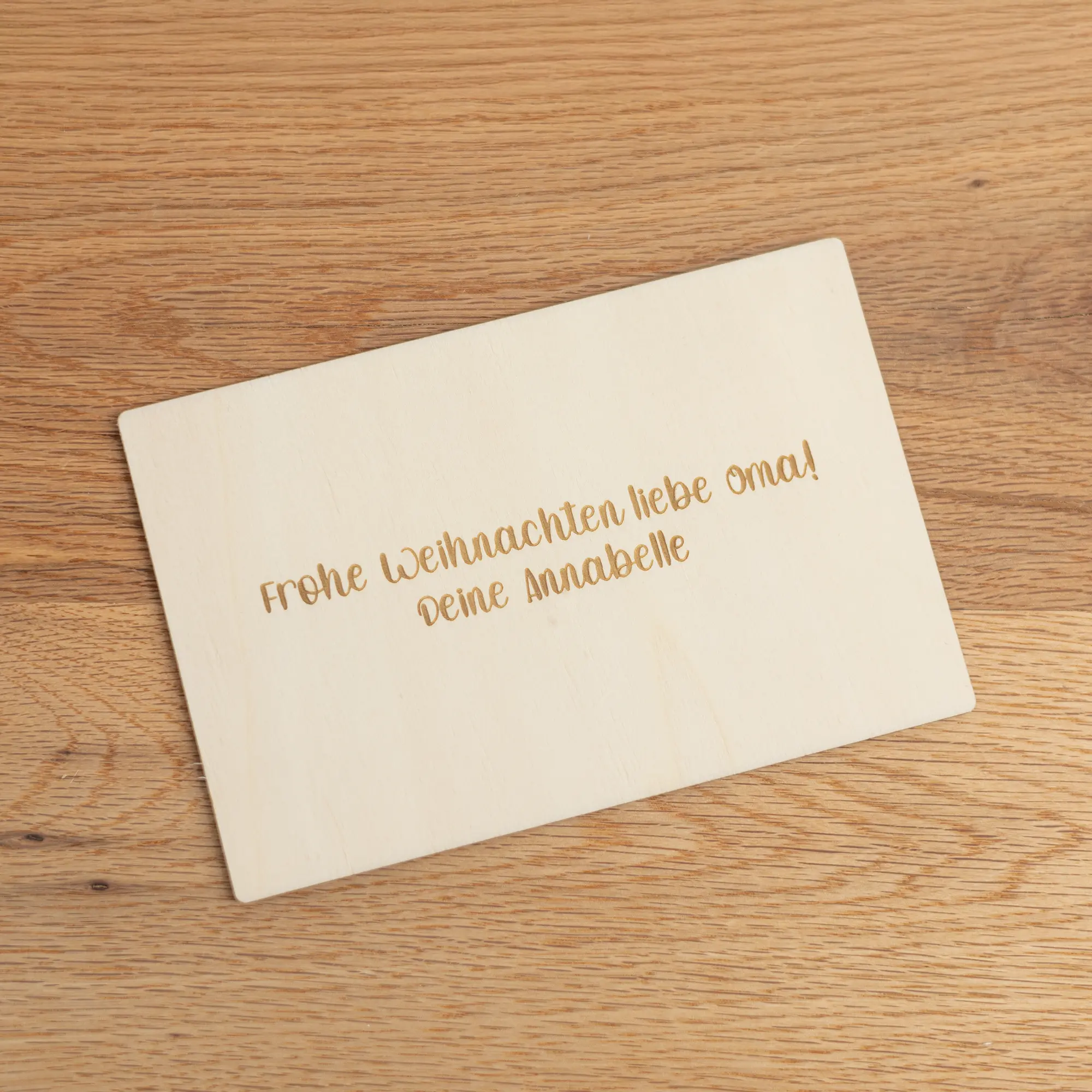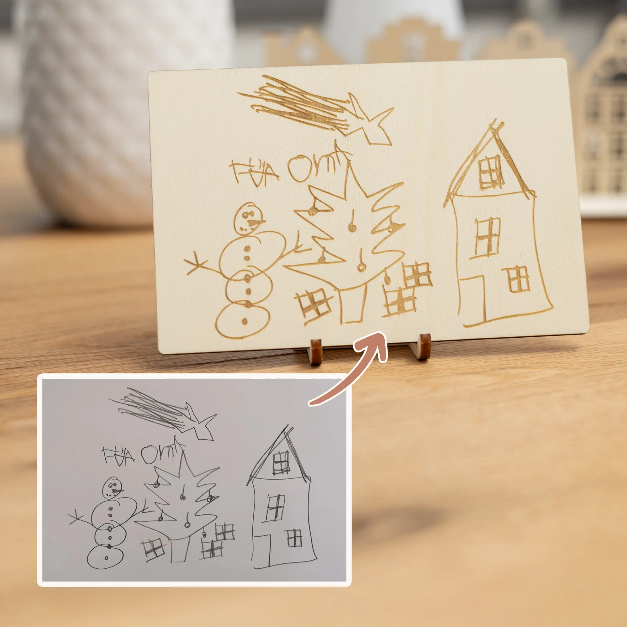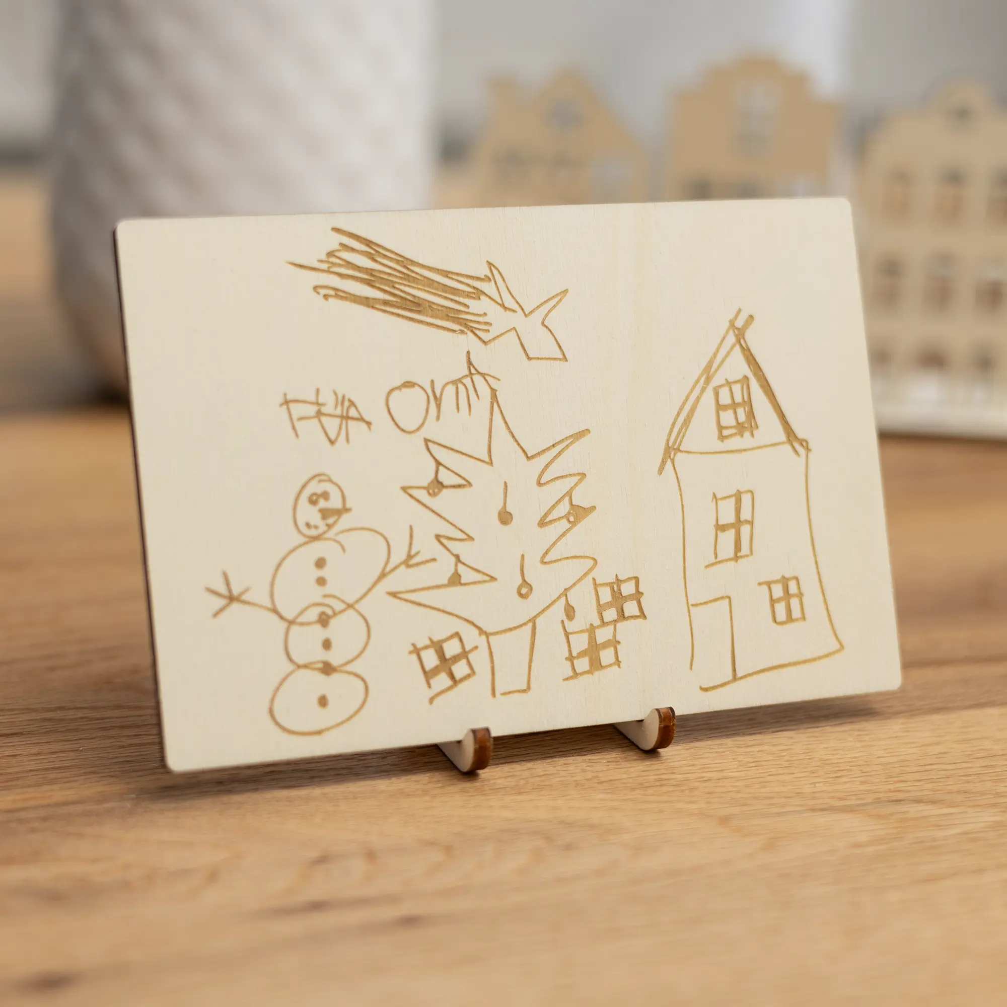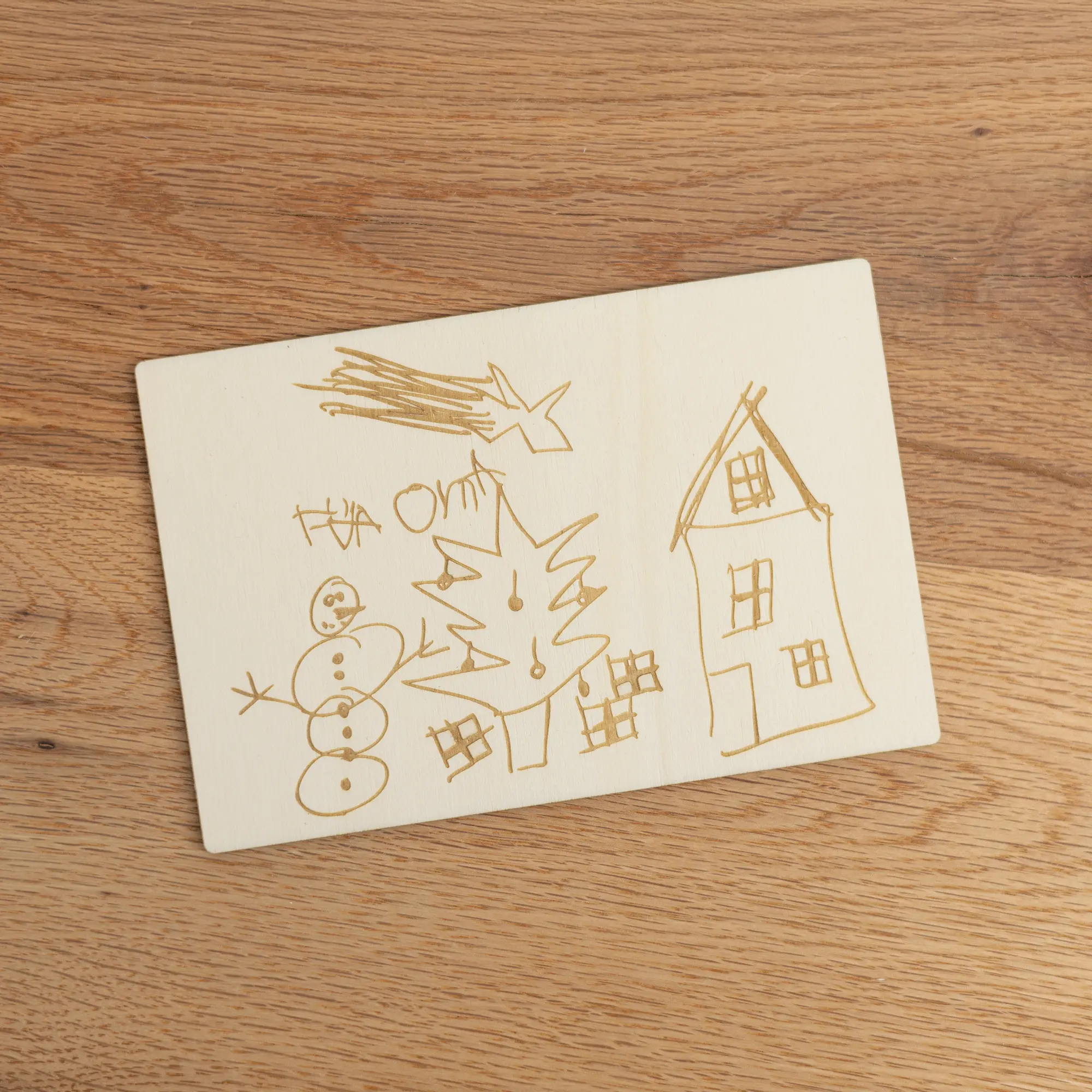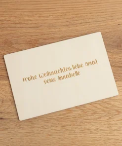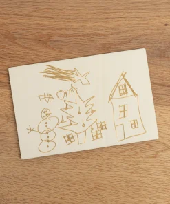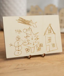 Für ganz persönliche Grüße Eurer Kinder habt Ihr mit unserer Grußkarte aus Holz – Kinderzeichnung die Möglichkeit, die Kunstwerke Eurer kleinen auf Grußkarten aus Holz gravieren zu lassen. Zusätzlich könnt Ihr, auf Wunsch, eine persönliche Botschaft in Textform mit auf die Karte drucken lassen. Dabei entscheidet Ihr über Platzierung und welche der 7 wählbaren Schriftarten Ihr haben möchtet. Optional könnt Ihr die Karte mit einem Kartenaufsteller erwerben, um sie als Dekoelement in der Wohnung aufzustellen.