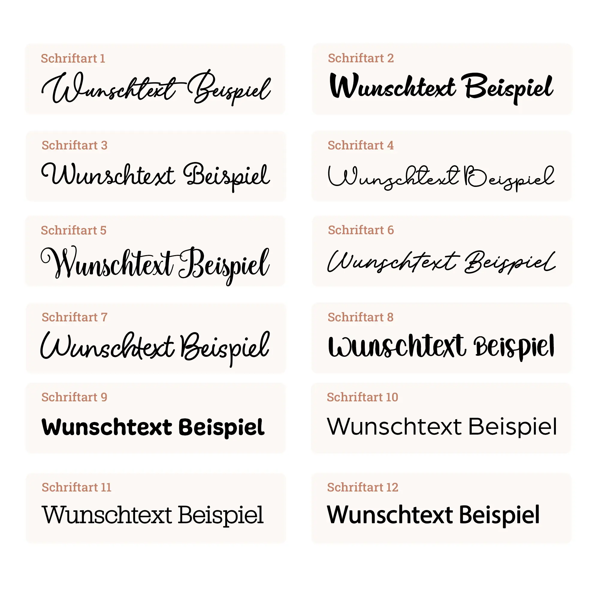 Zusätzlich zum eigenen Motiv kann optional ein eigener Wunschtext auf die Rückseite hinzugefügt werden, um eine Botschaft oder einen kurzen Gruß mit einzubinden. Dazu stehen Euch 12 Schriftarten zur Verfügung. Wählt einfach eure Wunschkonfiguration aus, tragt den Text ins vorgesehene Feld ein, tätigt die Bestellung und sendet uns anschließend Euer Wunschbild per E-Mail an [email protected].