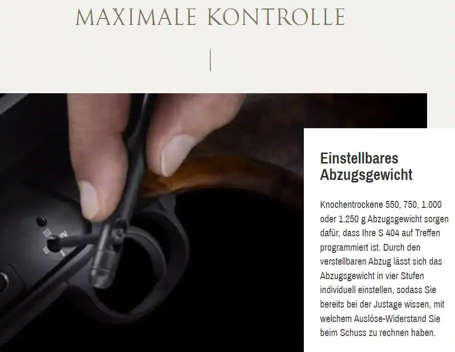 Außer dem Abzugsgewicht kann man bei diesem Wunderwerk an Büchsenbaukunst sogar die Lage des Abzugszüngels einstellen, da ein 8mm-Verstellweg längs und je 5 Grad Schwenkbereich nach links und rechts für die Individualisierung jeder Jägerin und Jäger den perfekten Kontakt zum Abzug ermöglichen. Instinktives Treffen ohne Kompromisse, die Repetierbüchse Sauer 404 schmiegt sich dem Schützen an, nicht umgekehrt.
