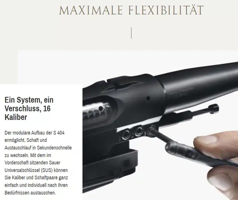 Wechselschaftpaare (so können Sie auch später je nach Anlass vom Holzschaft zum Polymerschaft hin- und herwechseln oder aus dem Stutzen eine federleichte Carbonschaftwaffe machen). Die SAUER 404 ist die modularste Büchse aus dem Hause SAUER & SOHN. Sie hat außerdem ihr Werkzeug immer dabei, denn Sie zerlegen die Waffe mit dem SUS in einer Zeit unter einer Minute auf kleinstes Packmaß, passend für die dazuklickbaren tollen Koffer aus dem SAUER Zubehörprogramm. Das Montieren und Demontieren der SAUER 404 erfolgt natürlich immer einfach und ohne extra Werkzeuge. Wechselschaftpaare können Sie im Bestellablauf im Konfigurator einfach hinzubuchen, ebenso übrigens auch Wechsellauf-Sets (Lauf, Verschlusskopf und Magazin), um mit wenigen Handgriffen aus z. B. der .243 Remmington Raubwildbüchse eine .375 Holland & Holland zu machen. Vollkommene Kompatibilität aller Teile untereinander macht diese Waffe multifunktional!