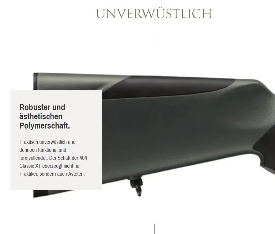 Der unglaublich robuste und dennoch ästhetische Polymerschaft der Handspanner Repetierbüchse Sauer 404 Classic XT macht seinen Job ohne Murren, sodass seine Griffigkeit bei Feuchtigkeit wie bei trockenem Wetter einem die nötige Sicherheit gibt für einen ruhigen Schuss, auch wenn es mal schnell gehen muss. Es besteht sogar wahlweise die Möglichkeit, die Waffe mit einen verstellbaren Schaftrücken auszurüsten. Der Gesamtschaft wird dann die etwas dezentere Farbe Daytona Gray haben.