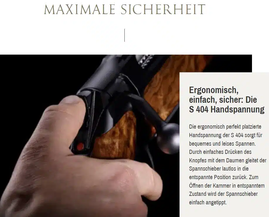 Die S404 Classic XT verfügt über ein patentiertes Sicherheitskonzept aus Handspannung und automatischer Schlagbolzensicherung. Die für höchste Ansprüche entwickelte Handspannung ermöglicht das bequeme Spannen und Entspannen der Büchse, intuitiv und völlig lautlos! Der Schieber ist für die perfekte Ergonomie mittig auf dem Schlösschen platziert.