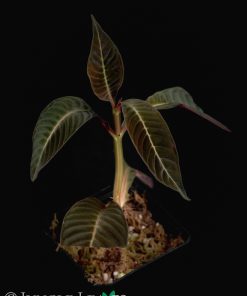 Sehr auffällig sind die Blattadern, die sehr regelmäßig angeordnet und tief eingesenkt sind, was dem Blatt ein bullates, geripptes Aussehen verleiht. Oberseits sind die Blätter samtig und dunkel und ihre Farben changieren von rötlich bis dunkelbraun, je nach Lichteinfall. Die Blattadern sind hell hervorgehoben. Unterseits sind die Blätter rot. Die Blüten sind klein und unscheinbar, weißlich bis rosa und erscheinen an Rispen mit 5 bis 20 Einzelblüten.