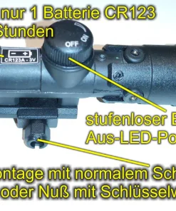 DAS NEUE DRÜCKJAGD-ZF 2021/2022! Professor Optiken Chemnitz Zielfernrohre, für den optimalen jagdlichen Einsatz bei Bewegungsjagden entwickelt, basieren auf den Erfahrungen von praxisorientierten Jägern, ganz besonders das neue Modell HQ Zielfernrohr Ammersee 1-6×24 HD Absehen 4 mit Leuchtpunkt . Das neue Modell verfügt über einen in 6 Stufen dimmbaren, für die Tag & Nachtjagd mit oder ohne Rechtlichtverstärker- oder Wärmebildvorsatz tauglichen, roten {tooltip} Leuchtpunkt – der auch mit Handschuhen gut bedienbare Schalter sitzt bei diesem Glas im gleichen Turm wie die Parallaxenverstellung. Die Batterie ist die handelsübliche, günstige CR2032 Lithium Batterie.