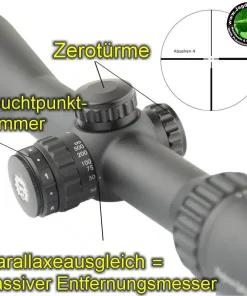 Die robusten Verstelltürme aus Metall sind außerdem mit einer Nullstellfunktion ausgestattet, mit der die Türme nach dem Einstellen auf Null zurückgesetzt werden können. Für die offene Verwendung ist eine größerer Ersatzturm für die Höhenverstellung im Lieferumfang enthalten. Mit dem seitlich angebrachten Parallaxenausgleich kann man schnell zwischen unterschiedlichen Schussentfernungen wechseln, ohne dabei an Bildschärfe zu verlieren.