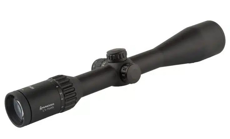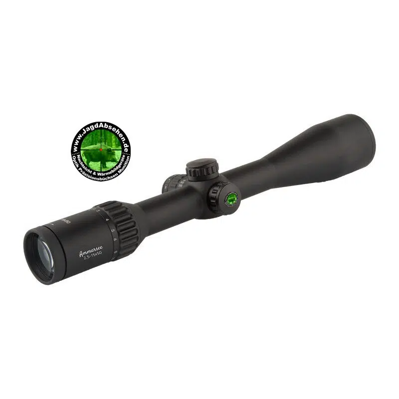 Ammersee 2,5-15×50: Professor Optiken Chemnitz Zielfernrohre, für den optimalen jagdlichen Einsatz entwickelt, basieren auf den Erfahrungen von praxisorientierten Jägern, ganz besonders das neue Modell HQ Zielfernrohr Ammersee 2,5-15×50 HD, Absehen Leuchtfaser G4 mit feinem Leuchtpunkt. Das Ammersee 2,5-15×50 verfügt über einen in 6 Stufen dimmbaren, für die Tag & Nachtjagd mit oder ohne Rechtlichtverstärker- oder Wärmebildvorsatz tauglichen, roten {tooltip} Leuchtpunkt – der auch mit Handschuhen gut bedienbare Schalter sitzt bei diesem Glas im gleichen Turm wie die Parallaxenverstellung. Die Batterie ist die handelsübliche, sehr günstige CR2032 Lithium Batterie. Aufgrund des großen Verstellbereichs von 2,5 bis 15-facher Vergrößerung kann dieses Zielfernrohr sowohl für die Jagd bei Ansitz & Drückjagd, als auch für Gebirgsjagd und das jagdlich/sportliche Schießen eingesetzt werden. Die Höhen und Seitenverstellung lässt sich sehr schnell und einfach mittels der hohen Dome/Türme bedienen und kann in 1/4 MOA-Schritten +/- 55 MOA verstellt werden.