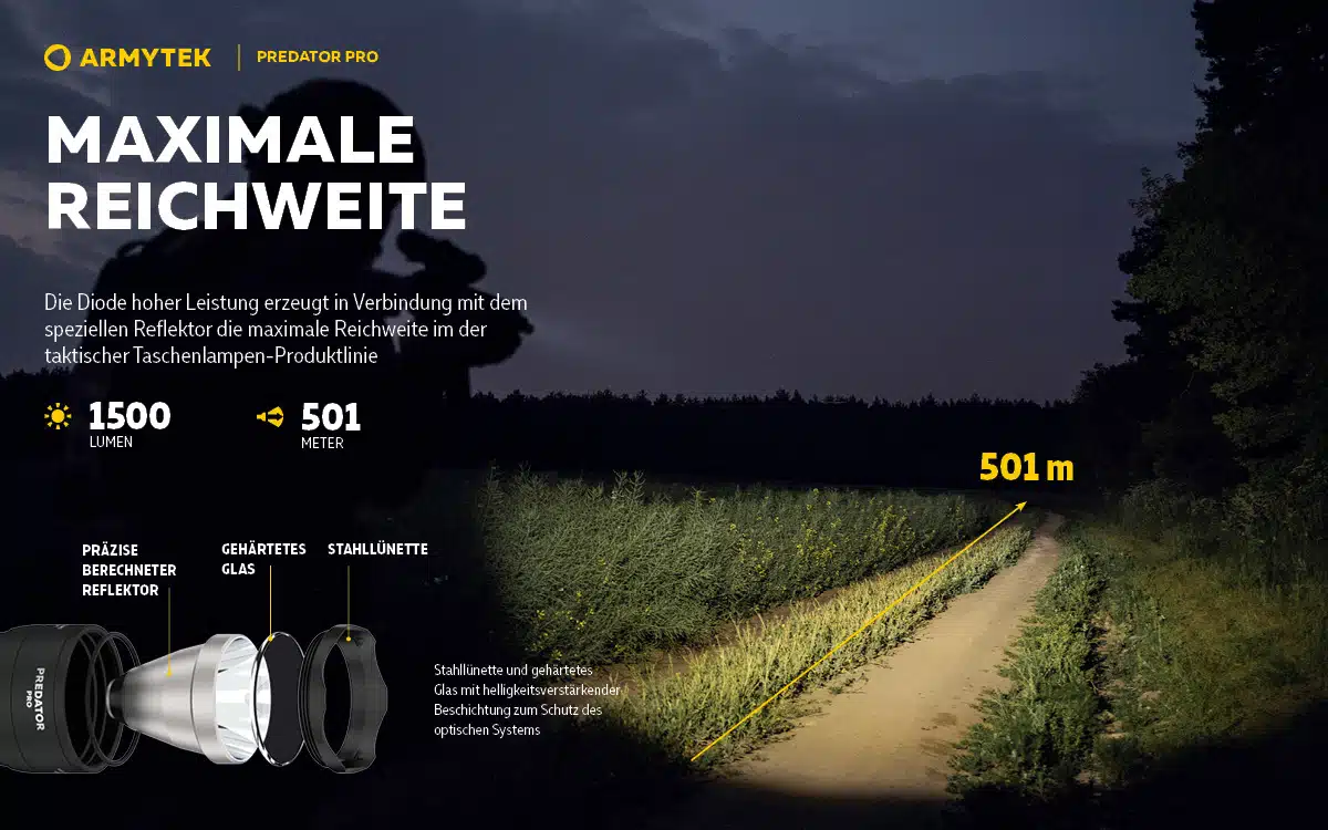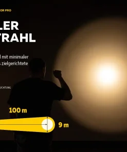 - In einer Entfernung von 100m beträgt der Durchmesser des Lichtkegels der Jagd Taschenlampe Predator Pro nur 9m!