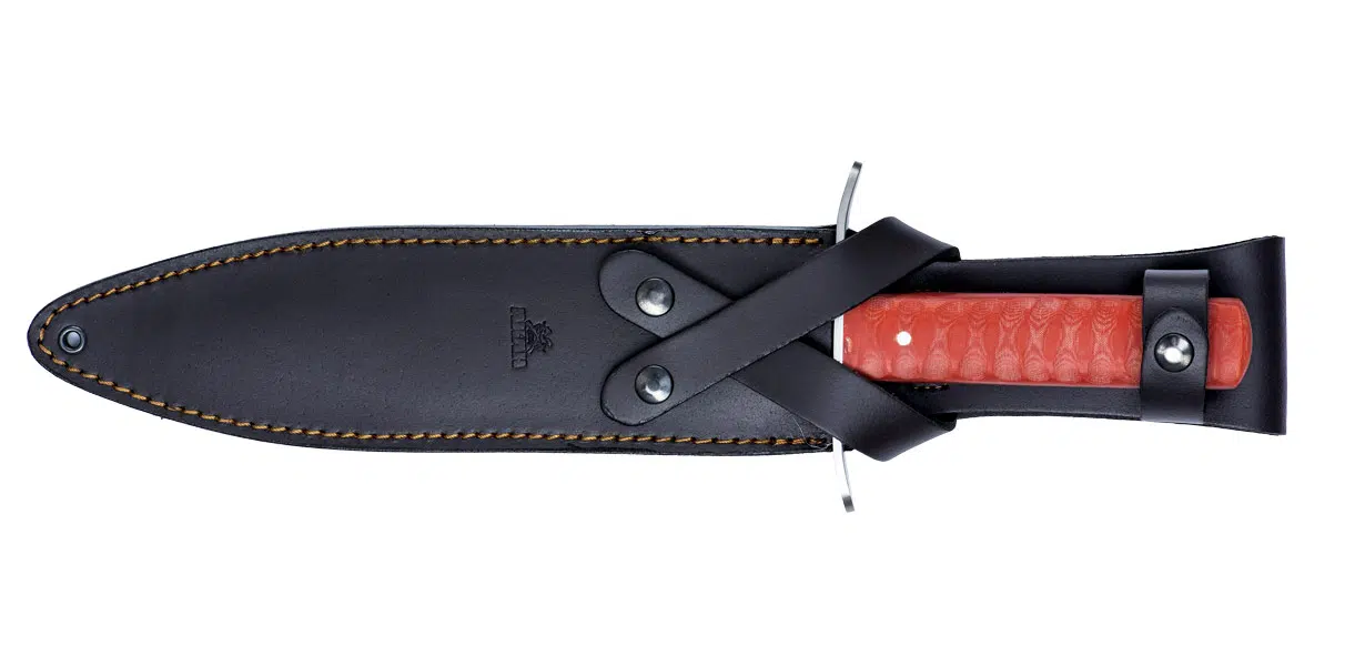 Robuste, handgenähte Lederscheide mit Metalldruckknöpfen aus der AKAH-Ledermanufaktur, die unteren Doppelriemen schützen zusätzlich vor Verlust durch Verlieren.