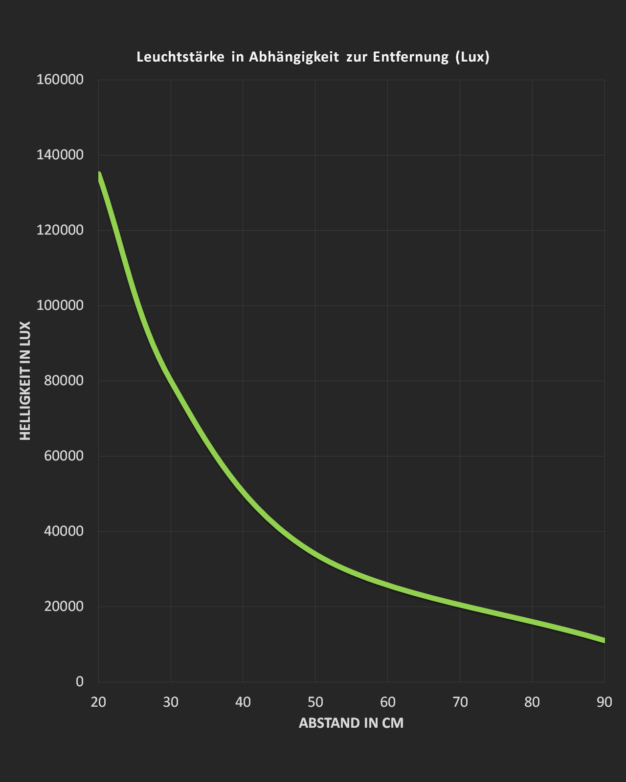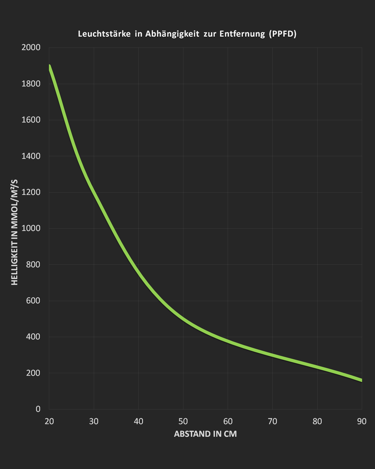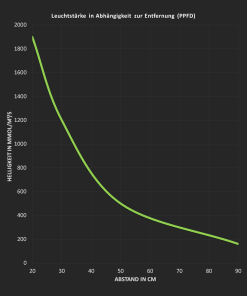 Es sind ausschließlich hocheffiziente Dioden verbaut, wodurch bei einer Leistungsaufnahme von nur 50W ein Lichtstrom von >7500 Lumen bzw. 100 μmol/s erreicht wird. Das entspricht 150 Lm/W oder 176% der Lichtleistung herkömmlicher Dioden, inkl. Netzteil und Rotanteile! Der PPE-Wert der Lichtquelle liegt bei 2,2 μmol/s/W.
