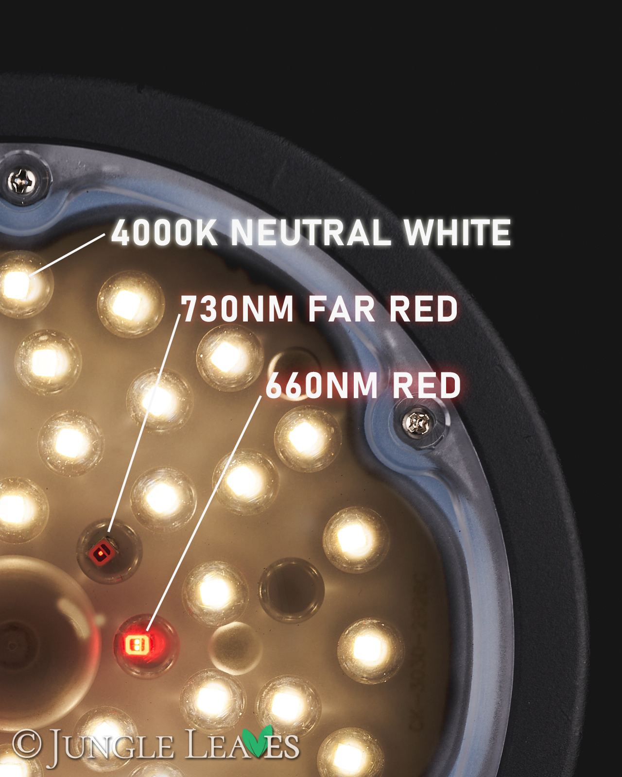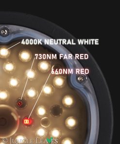 Durch Kombination von 4000K (neutralweiß) und 660nm (rot) Dioden ergibt sich nicht nur ein optimales Spektrum für das Wachstum von Pflanzen, sondern auch eine angenehme Lichtfarbe mit einer hohen Farbwiedergabe (CRI ~85). Auch sehr gut kombinierbar mit unseren ebenfalls neutralweißen Jungle Lux Linear Pflanzenlampen in Röhrenförm für eine Grundbeleuchtung.