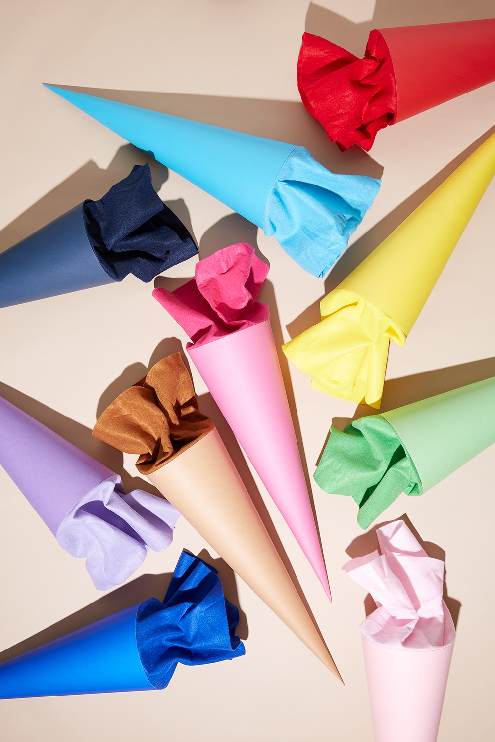 Diese kleinen Spitztüten sind wunderschön und aus stabilem Karton gefertigt. Das Papier hat eine matte Oberfläche und kann fabelhaft beklebt werden. Dank des schon integrierten Filzverschlusses kannst du dich komplett auf das Dekorieren konzentrieren und wirst in wenigen Bastelschritten deine ganz persönliche Geschwister-Traumtüte in den Händen halten.