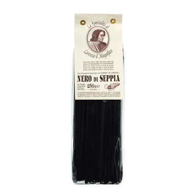 Hartweizengriesnudeln mit Weizenkeimen und Tintenfischtinte. Kräftige, schwarze Farbe. Ideal zu allen Fisch- oder Muschelgerichten mit einer Sahne-Safran-Sauce. Die Produkte der 1860 gegründeten Firma Morelli sind einzigartig, da man im Produktionsprozess den Weizenkeim wieder hinzufügt. Er ist reich an Vitamin E,D und pflanzlichen Proteinen.