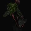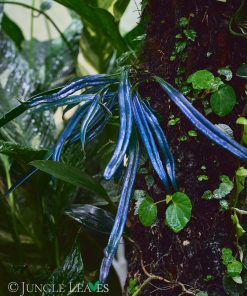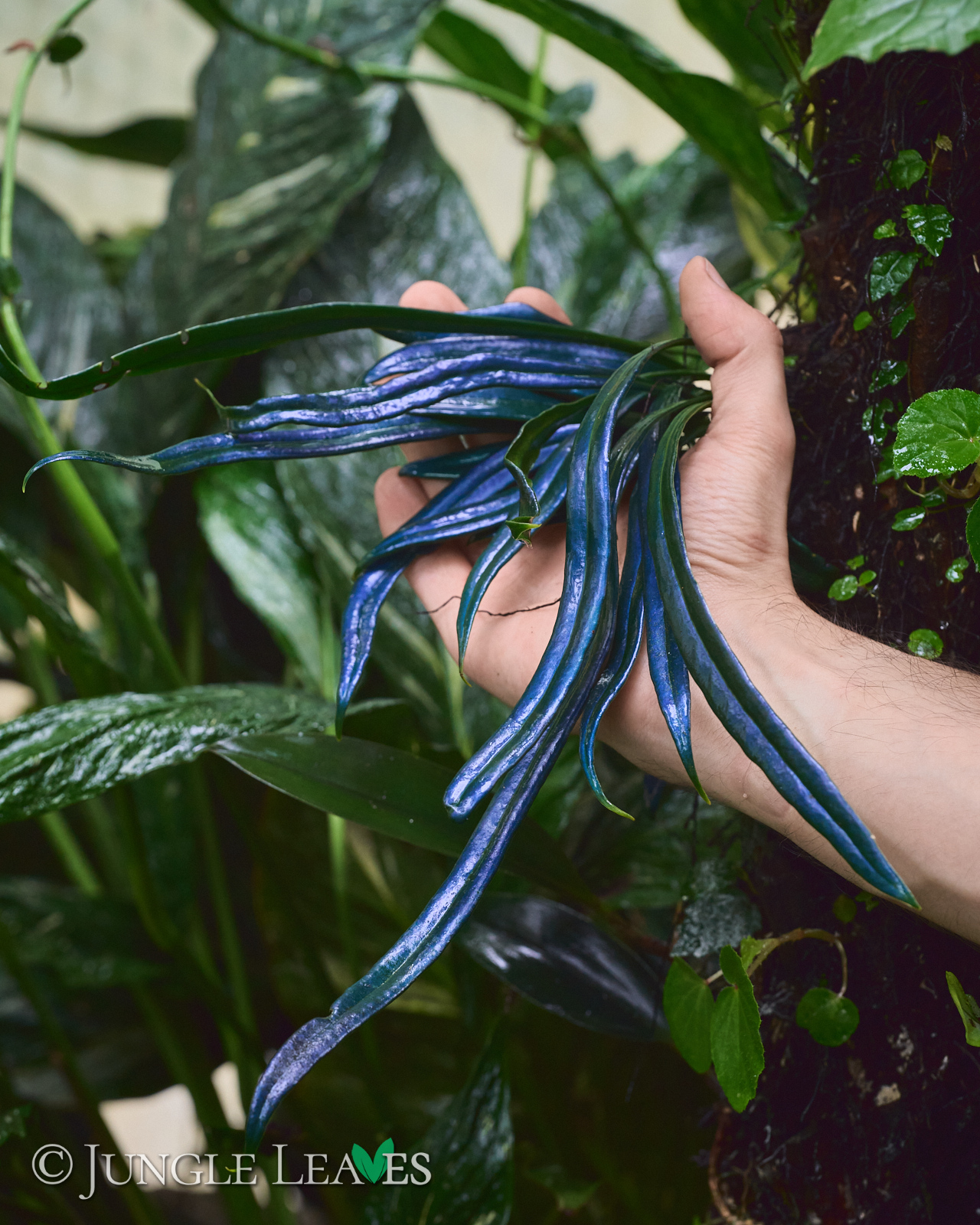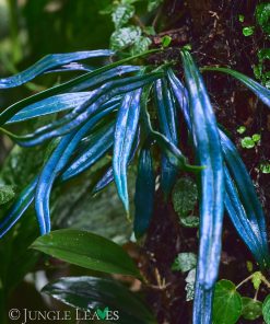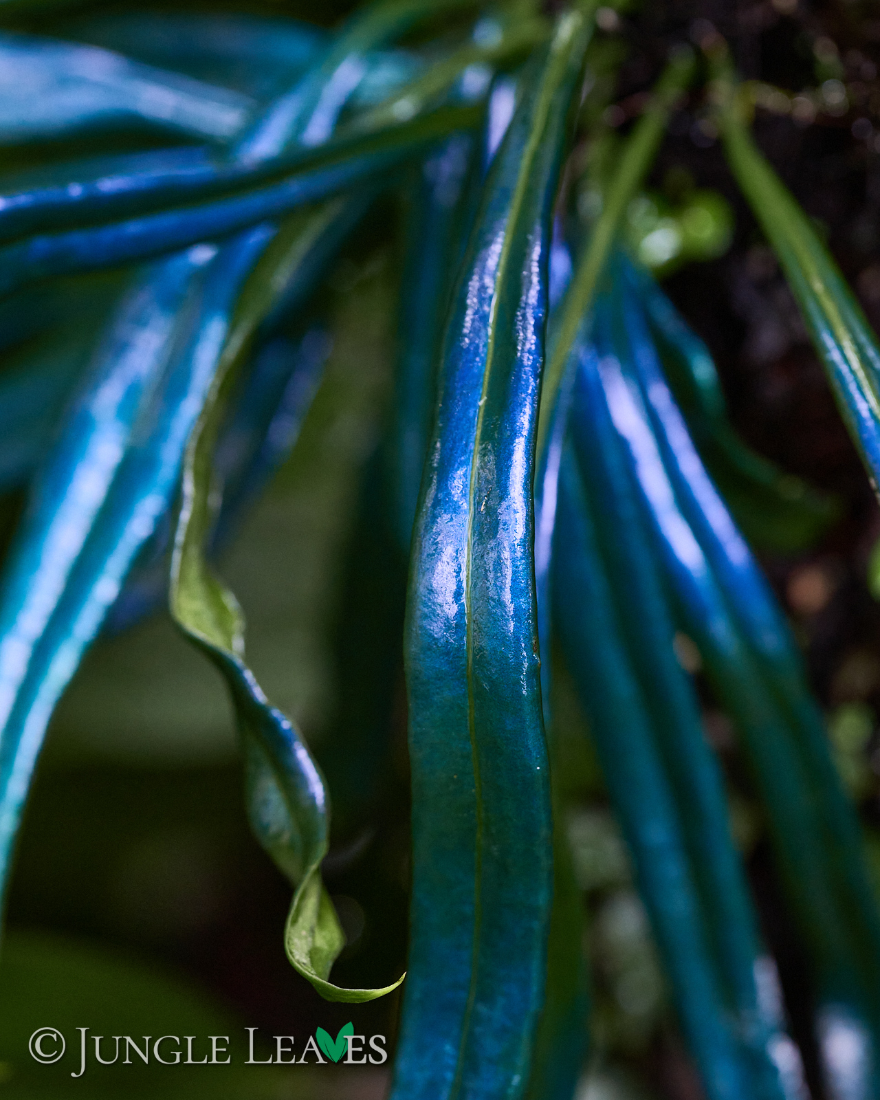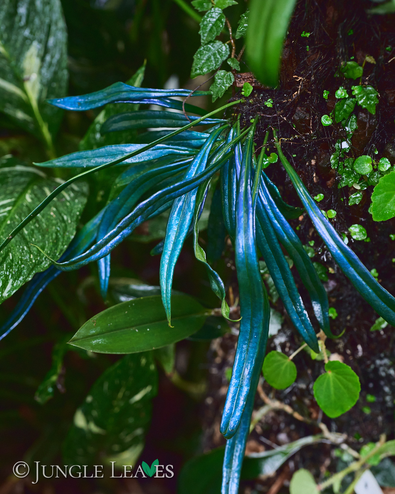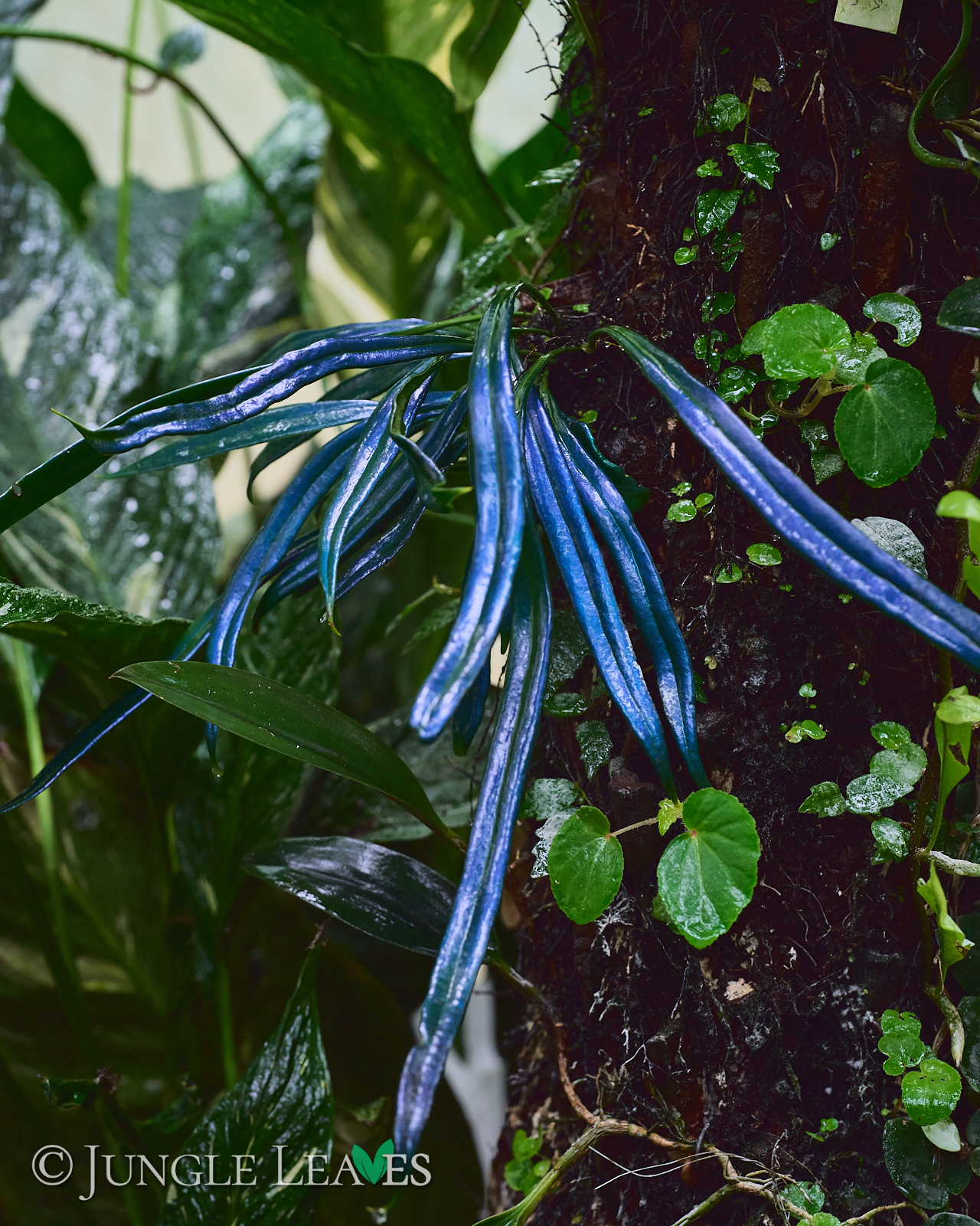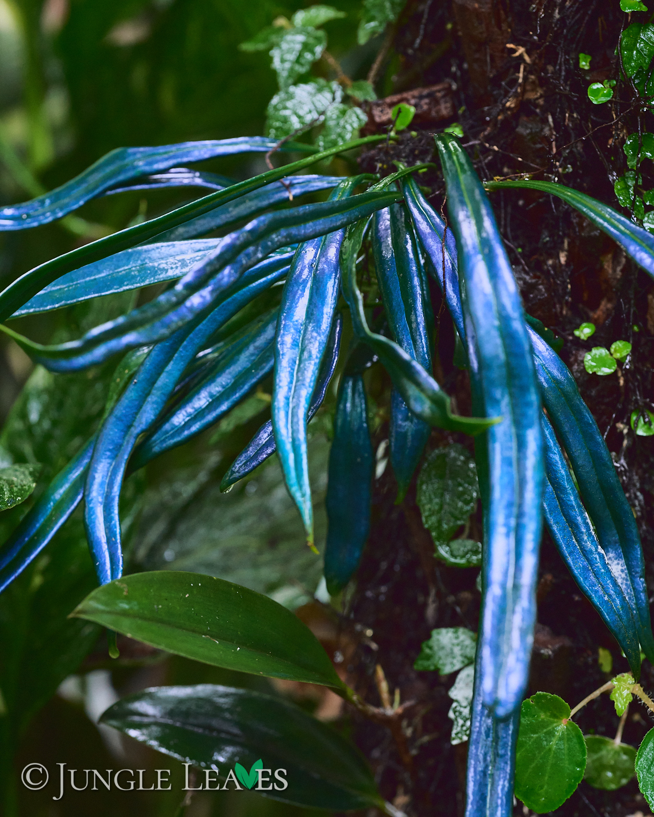 M. thailandicum wächst mit einem kompakten, kletternden Rhizom. Die Blätter sind linealisch (lang und dünn, mit gleichmäßiger Breite) und werden etwa 20 bis 30 cm lang und 2 bis 3 cm breit. Sie sind auffällig verdickt und hart, fast sukkulent mit einer eingesenkten Mittelrippe. Oberseits sind die Blätter tief metallisch blau gefärbt. Im Gegensatz zur blauen Irideszenz bei Begonien, welche man nur betrachten kann, wenn es dunkel ist und man mit einer Taschenlampe oder einem Blitzlicht aus einem bestimmten Winkel auf die Blätter leuchtet, ist die blaue Farbe bei M. thailandicum immer zu sehen. Auch ein benetzen der Blätter mit Wasser lässt die Farbe nicht verschwinden sondern im Gegenteil eher intensiver erscheinen. Die für die Färbung verantwortlichen Nanostrukturen sind andere als bei Begonien. Details dazu stehen in diesem Blogbeitrag.