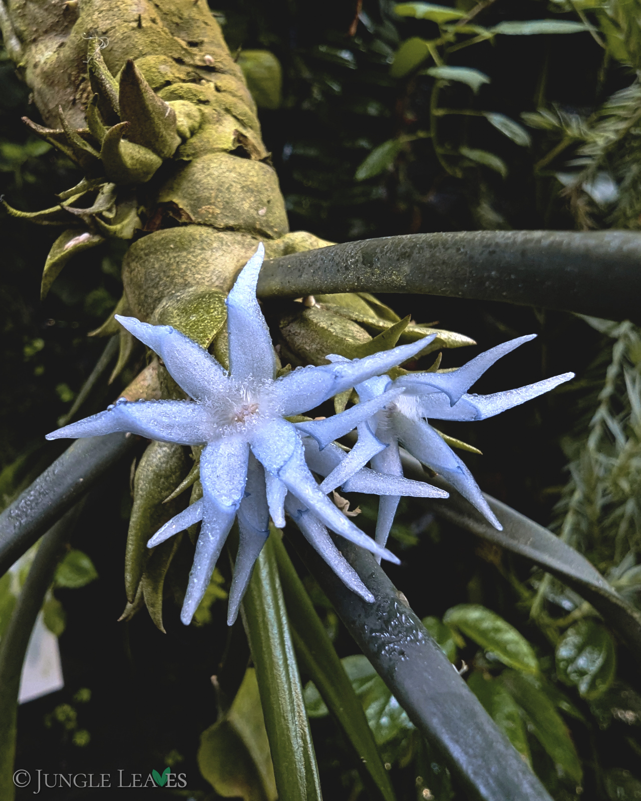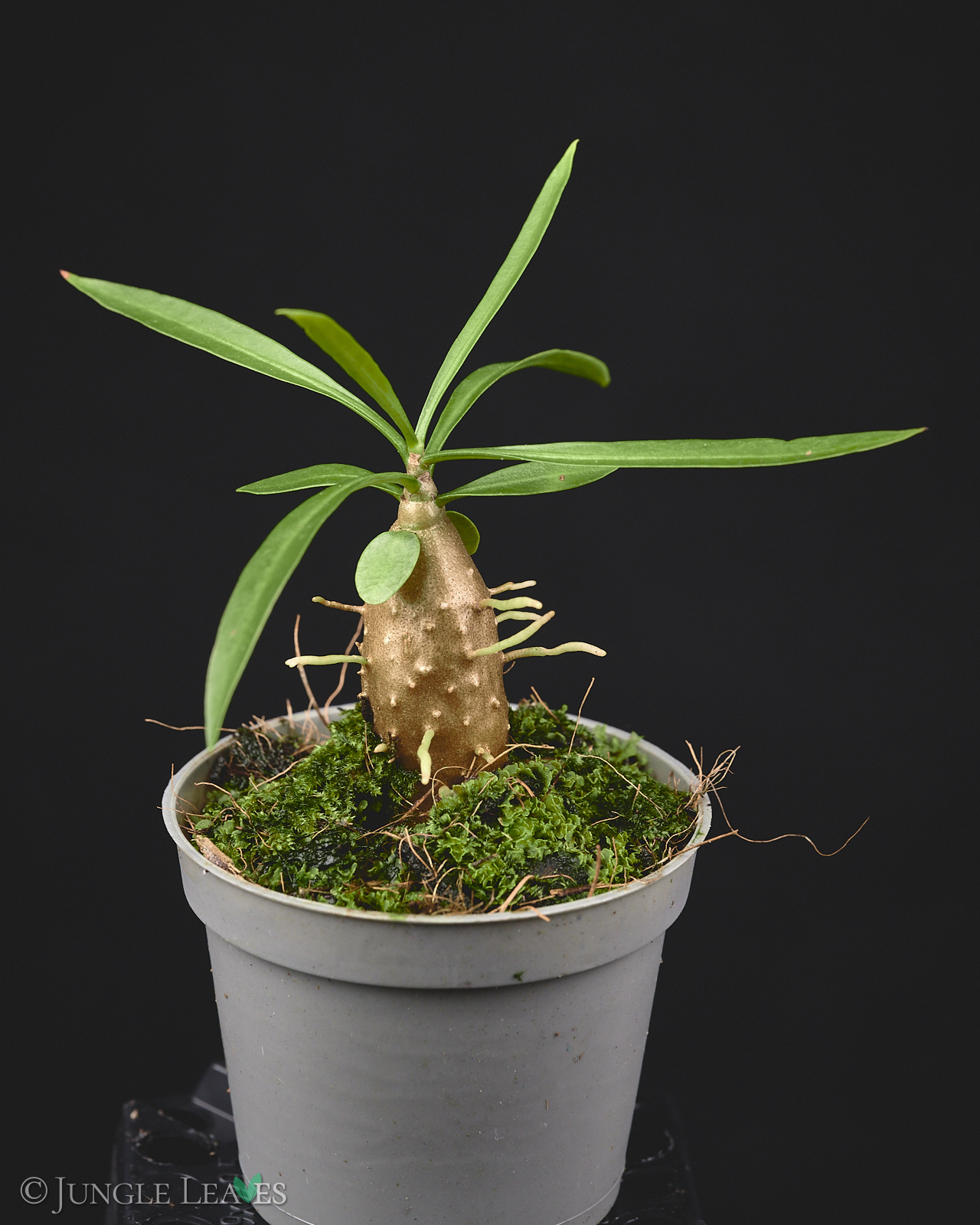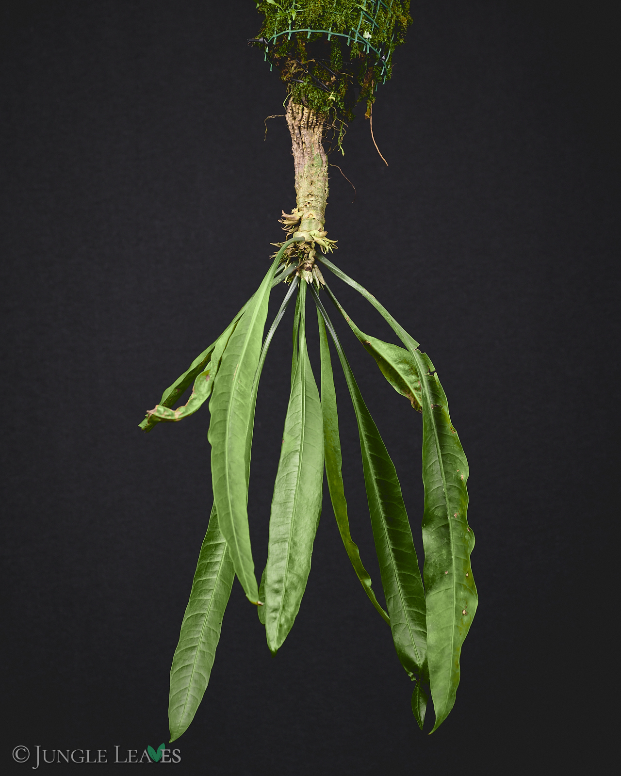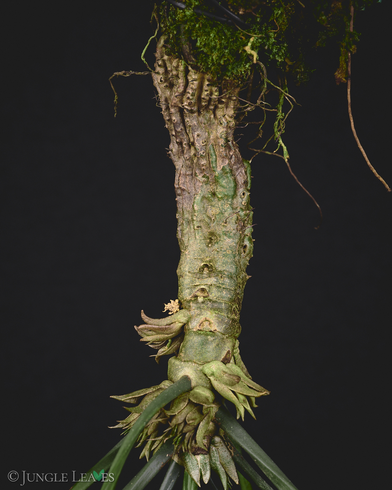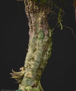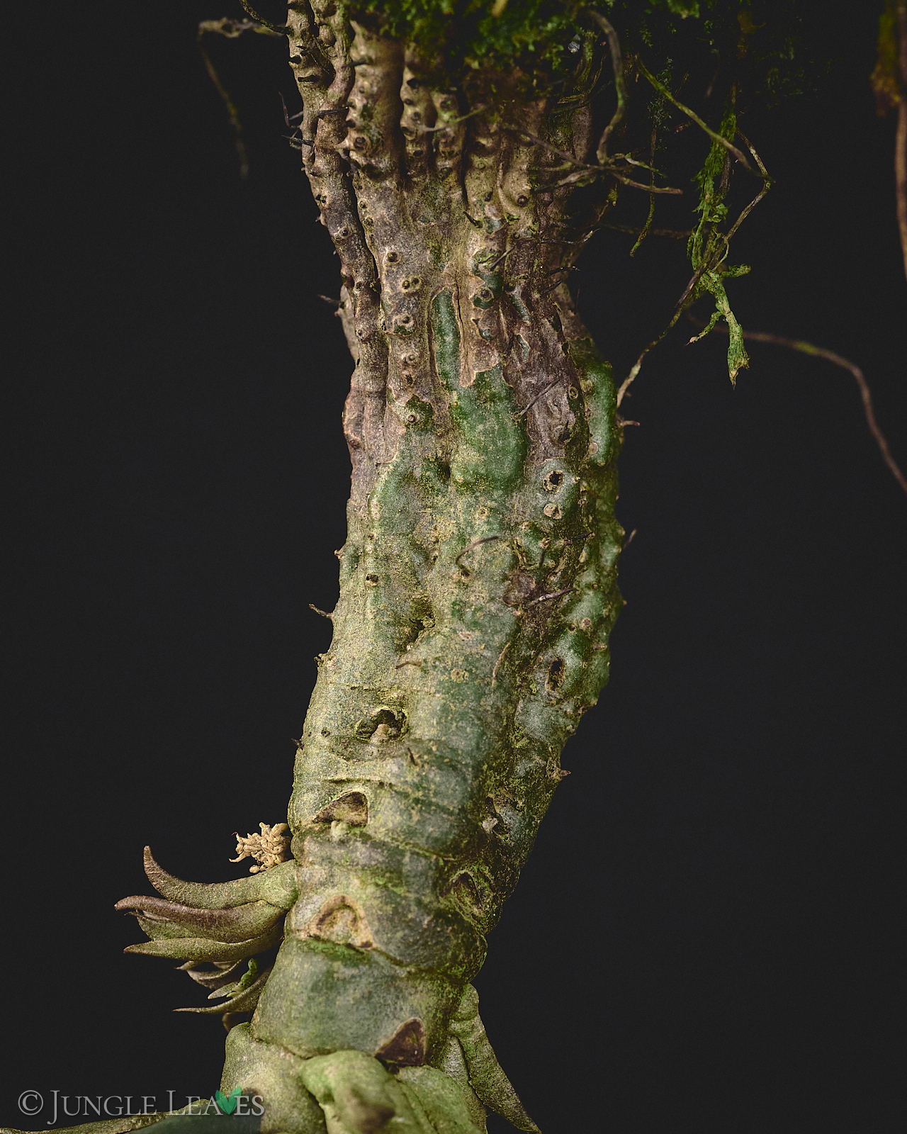Der Caudex ist länglich, mit bedornten „Leisten“ und die Pflanze hängt in der Natur meist „kopfüber“ an großen Bäumen im Tieflandregenwald. Die Oberfläche ist von zahlreichen kleinen Löchern übersät.