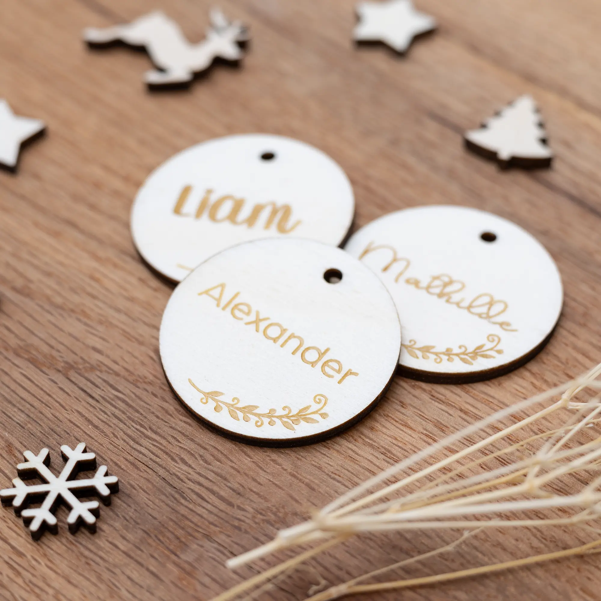 Macht euren Lieben eine kleine persönliche Freude mit personalisierten Geschenkanhängern für Weihnachten aus Holz. Die Geschenkanhänger werden mittels Lasercut ausgeschnitten und danach mit euren Wunschnamen präzise graviert. Dadurch erhaltet Ihr eine rustikale und vor allem schöne Alternative zu den typischen Namenskarten aus Papier. Die Geschenkanhänger könnt Ihr ganz einfach an eure Geschenke mittels eines Fadens binden, aber auch an anderen Dingen wie Geschenktüten oder Körben anbringen. Auch sind sie das perfekte Accessoire für DIY Weihnachtsgeschenke! Die den Namensschriftzug könnt Ihr in einer von 12 Schriftarten wählen.