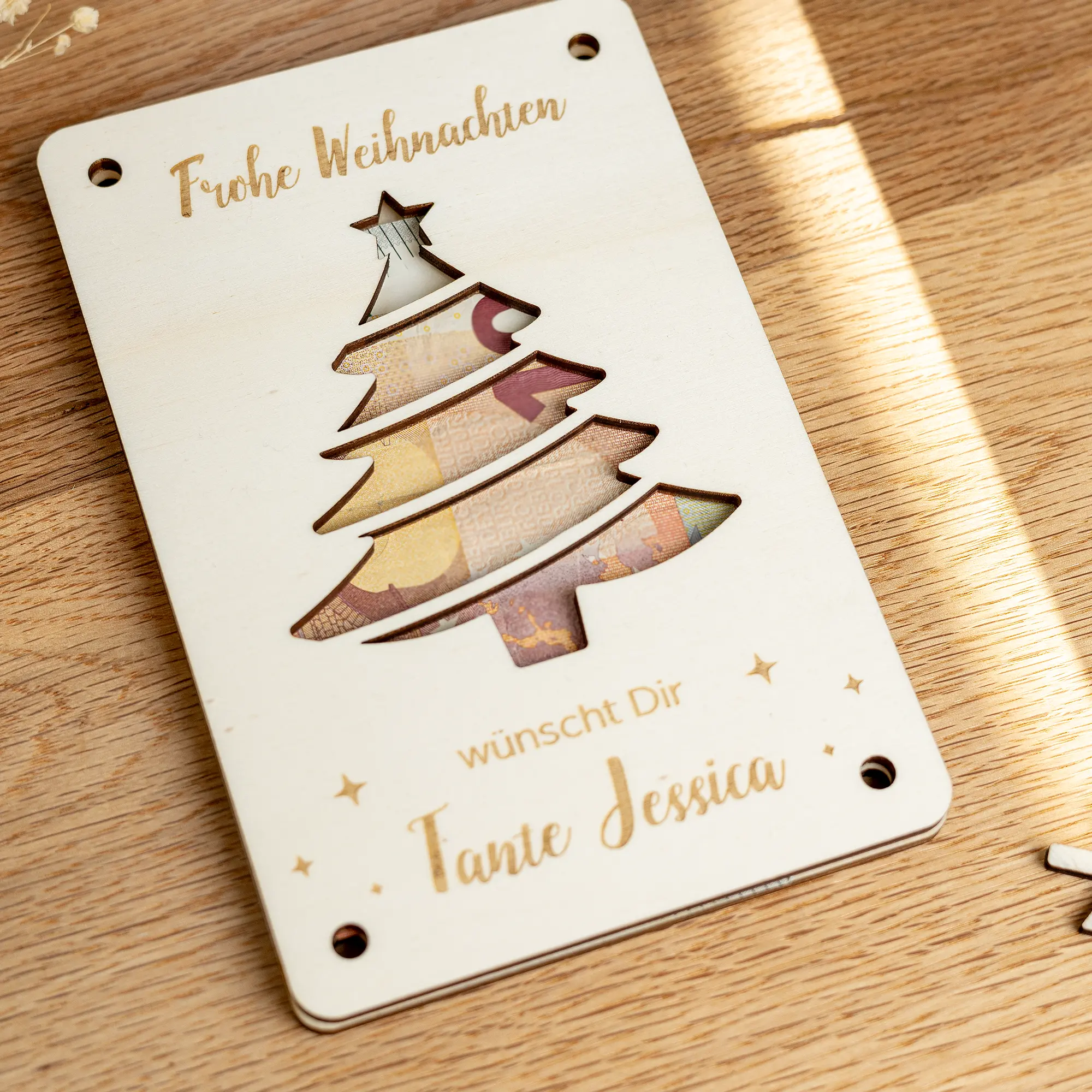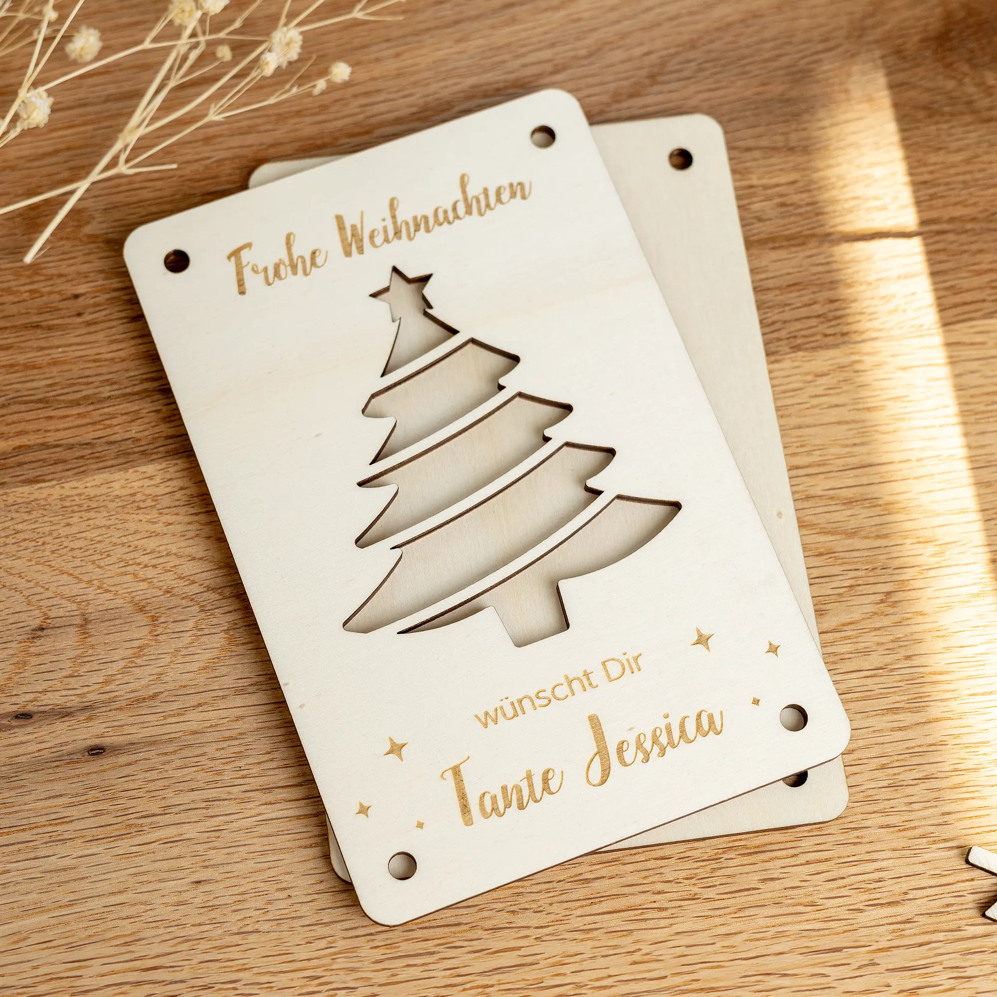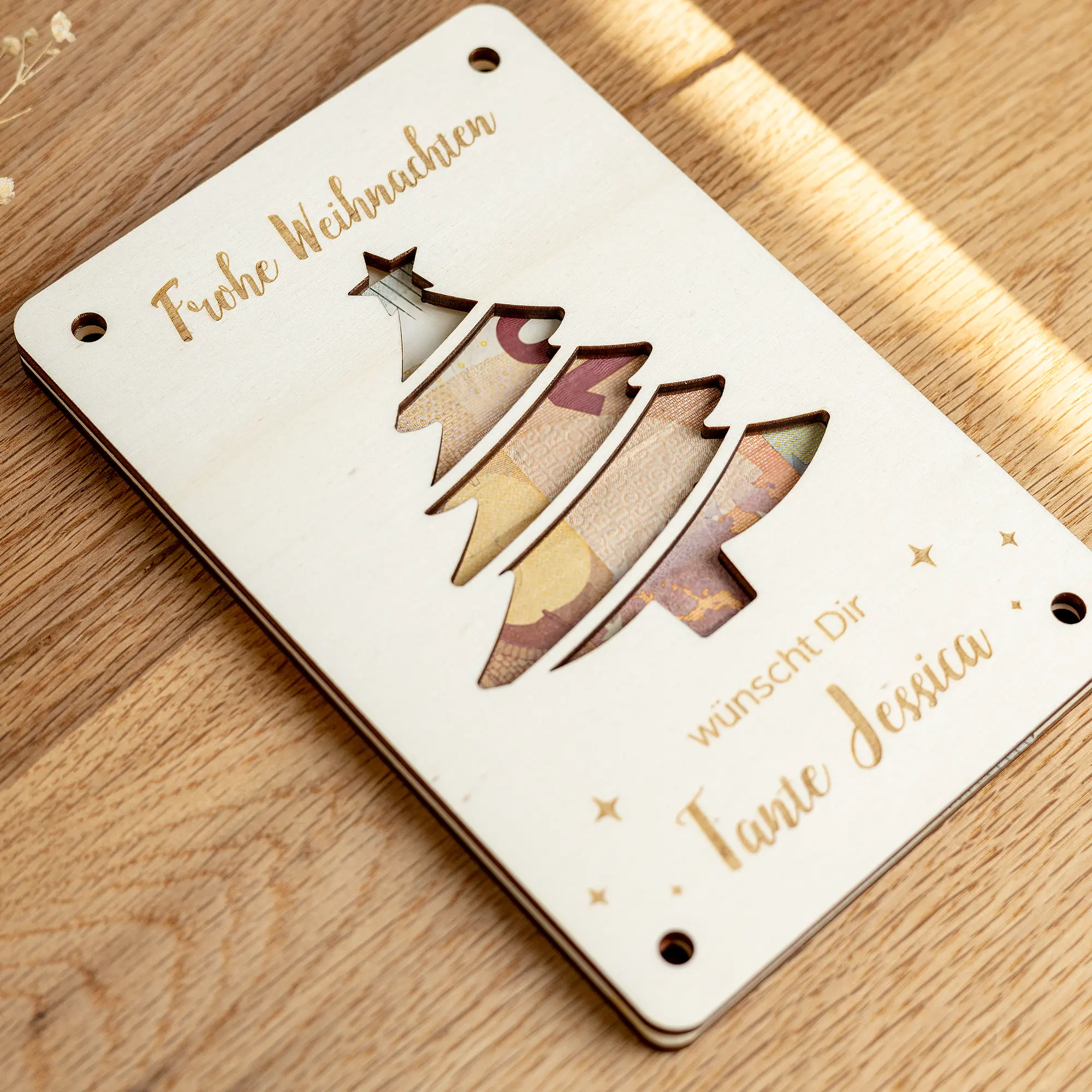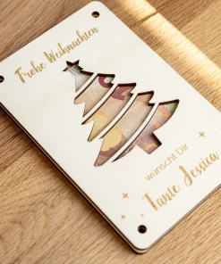Verschenkt mit unserer personalisierten Geschenkkarte aus Holz eine schöne und vor allem natürliche Alternative zu den bekannten Papierkarten und Umschlägen. Unsere personalisierte Geschenkkarte eignet sich nämlich, mit dem Ausschnitt eines Weihnachtsbaummotivs, perfekt für jede Art von Weihnachtsgeschenken in Papierform, da diese ganz einfach und direkt durch die per Lasercut ausgeschnittenen Stellen bereits erkannt werden können. Abgerundet wird das Ganze dann noch durch eure persönlichen Weihnachtsgrüße bzw. eurer Personalisierung, welche wir auf der Geschenkkarte eingravieren. So könnt Ihr Eure Geldgeschenke, Gutscheine, Konzertkarten oder auch andere Ideen in einer kreativen und besonders persönlichen Art verpacken. Zudem eignet sich das schlichte, aber weihnachtliche Design optimal für alle Altersklassen. Ob für eure Kinder, die Enkelkinder, Oma und Opa oder eure Freunde könnt ihr mit dieser ausgefallenen und vor allem persönlichen Karte ein kleines Lächeln aufs Gesicht zaubern.