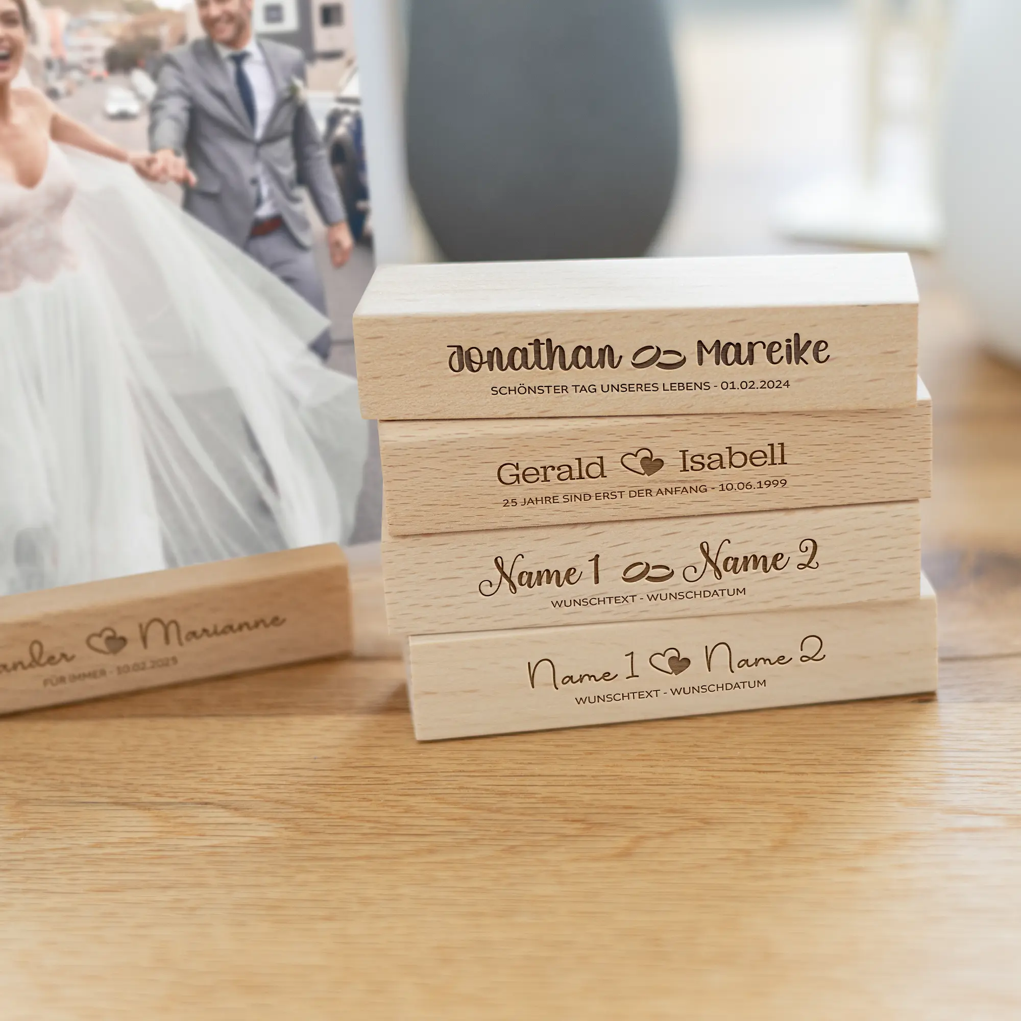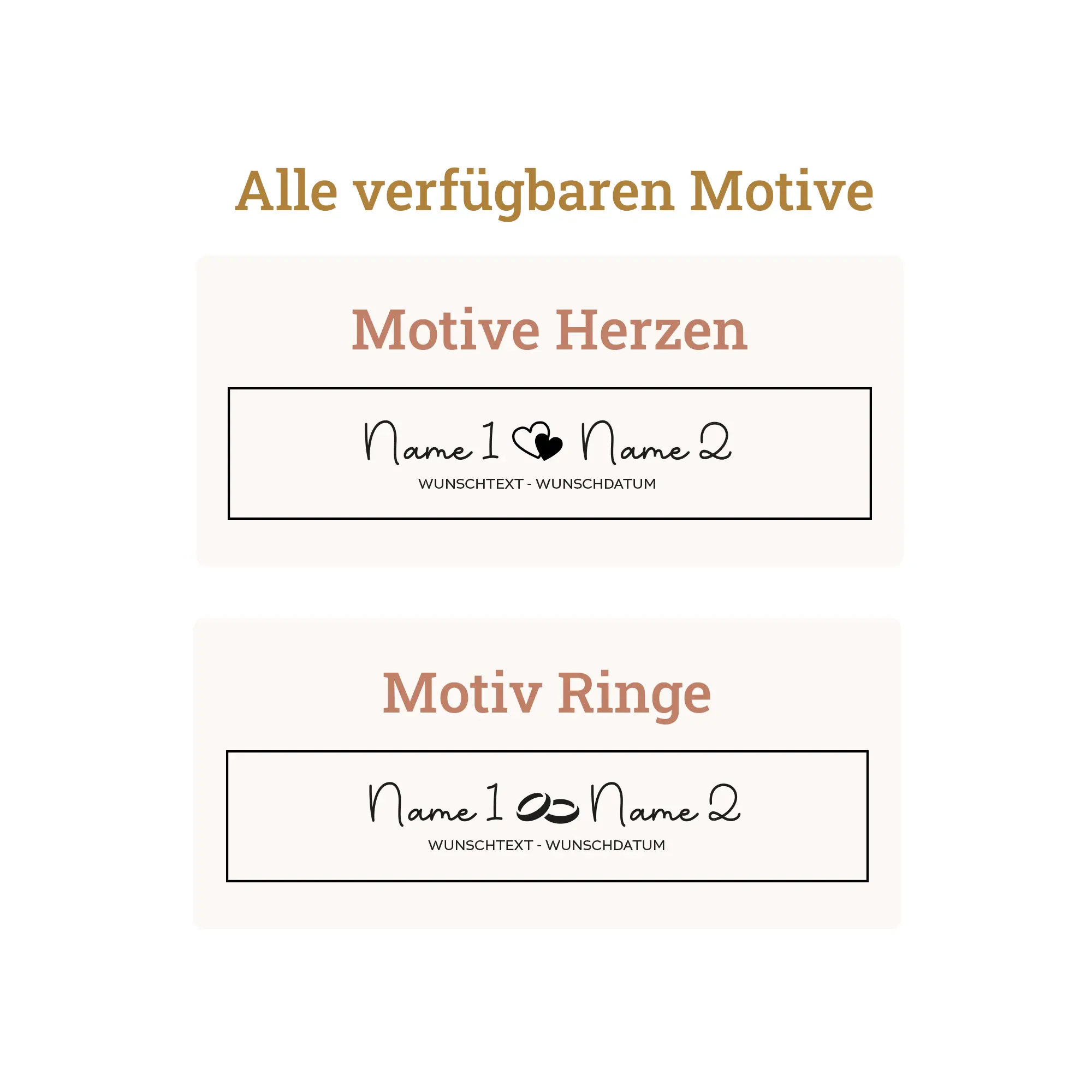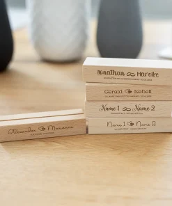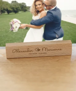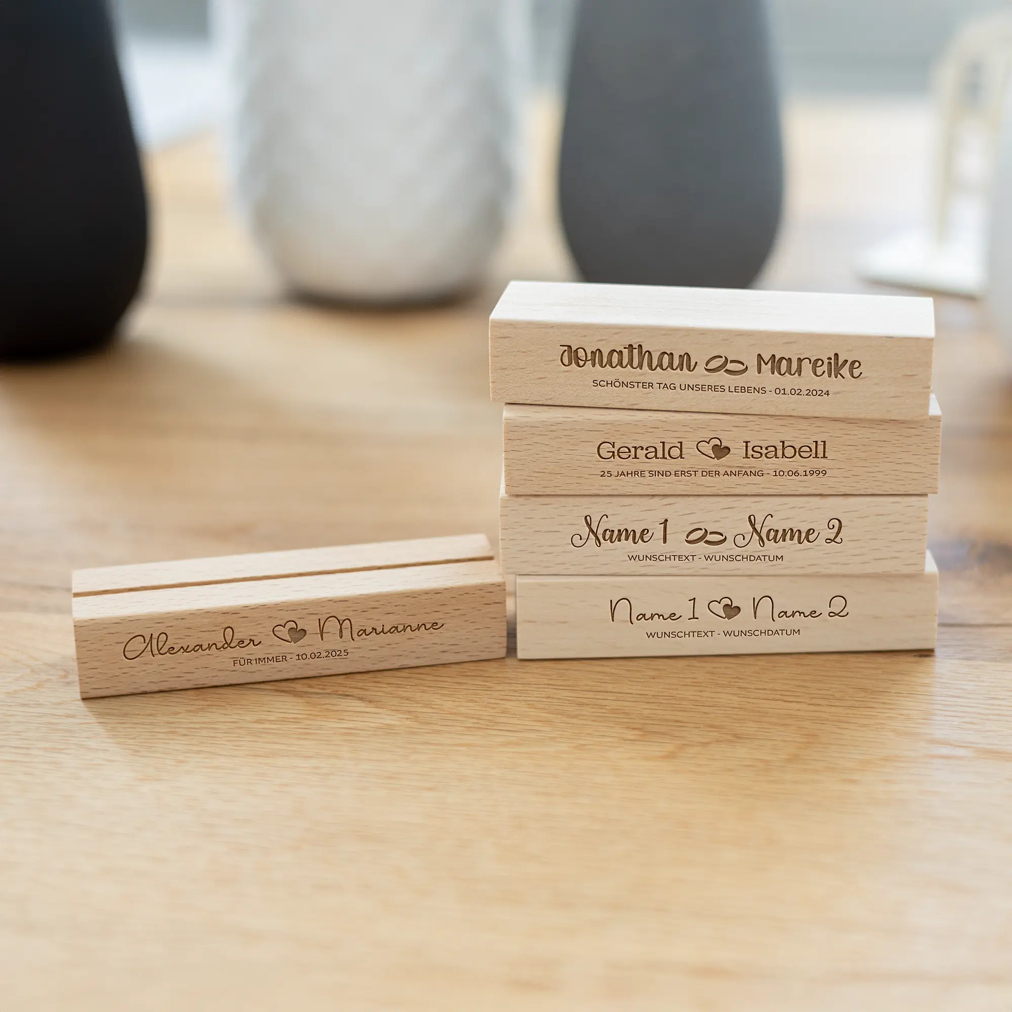 Entdeckt unseren personalisierten Kartenaufsteller für Hochzeiten aus hochwertigem Pappelholz! Mit den Maßen von ca. 10 cm x 2 cm ist dieser elegante Kartenhalter die perfekte Ergänzung für jede Hochzeitstafel. Wählt aus zwei verschiedenen Gestaltungen und 11 Schriftarten, um Euren Wunschtext individuell anzupassen. Ob die Namen des Brautpaares, ein besonderer Spruch zusammen mit dem Hochzeitsdatum – dieser Kartenaufsteller bietet Platz für deine persönlichen Wünsche.