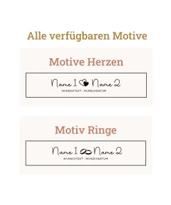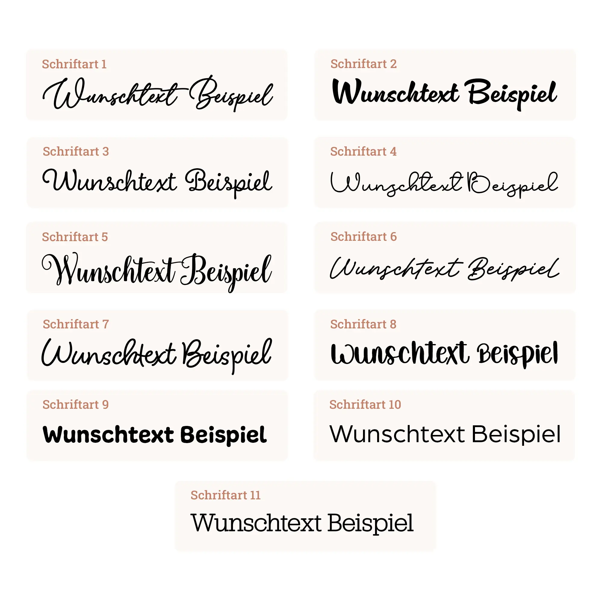 Wählt einfach eure Wunschkonfiguration und gebt Euren Text und eventuelle abweichende Platzierungen der Motive in das vorgesehene Feld ein und wir erledigen den Rest.