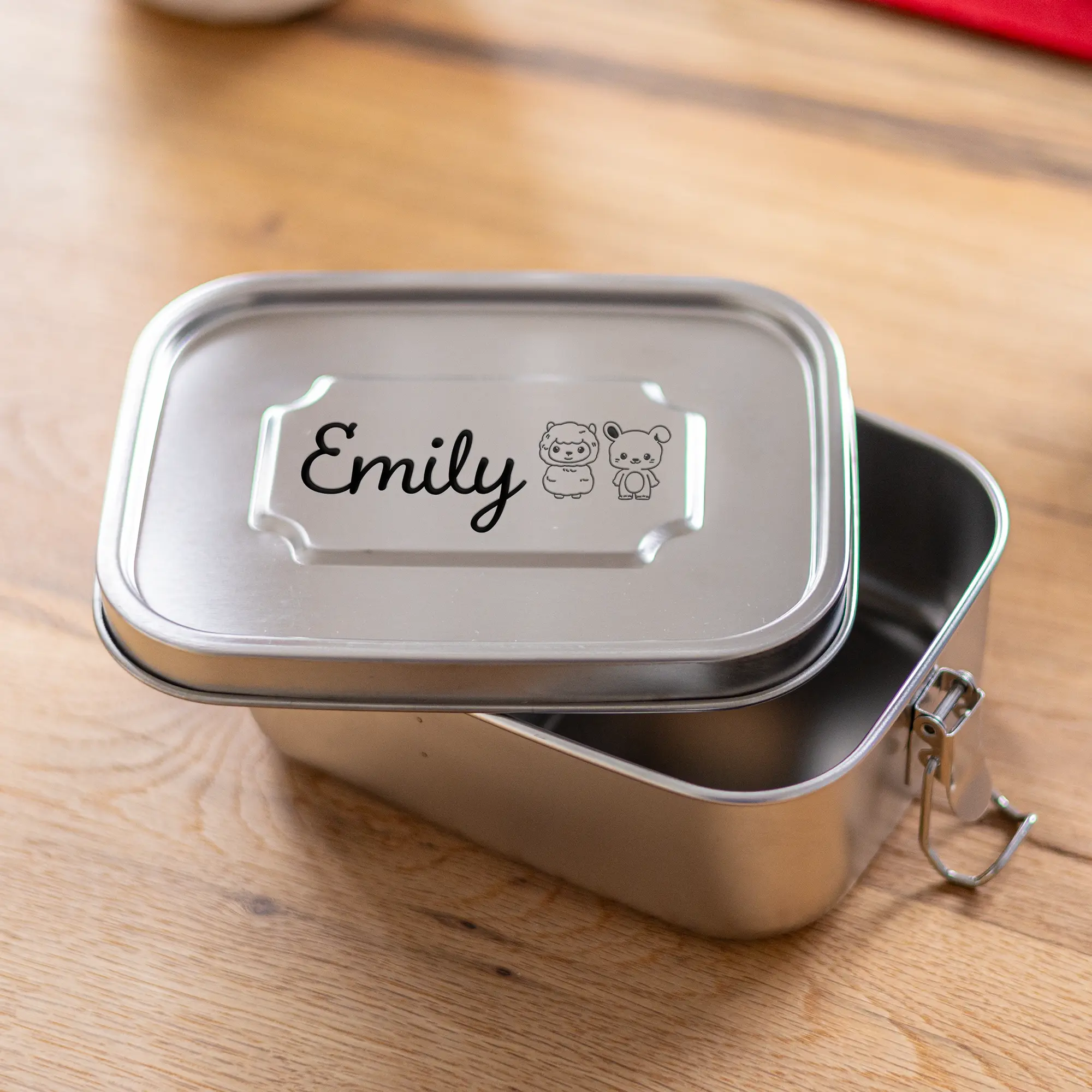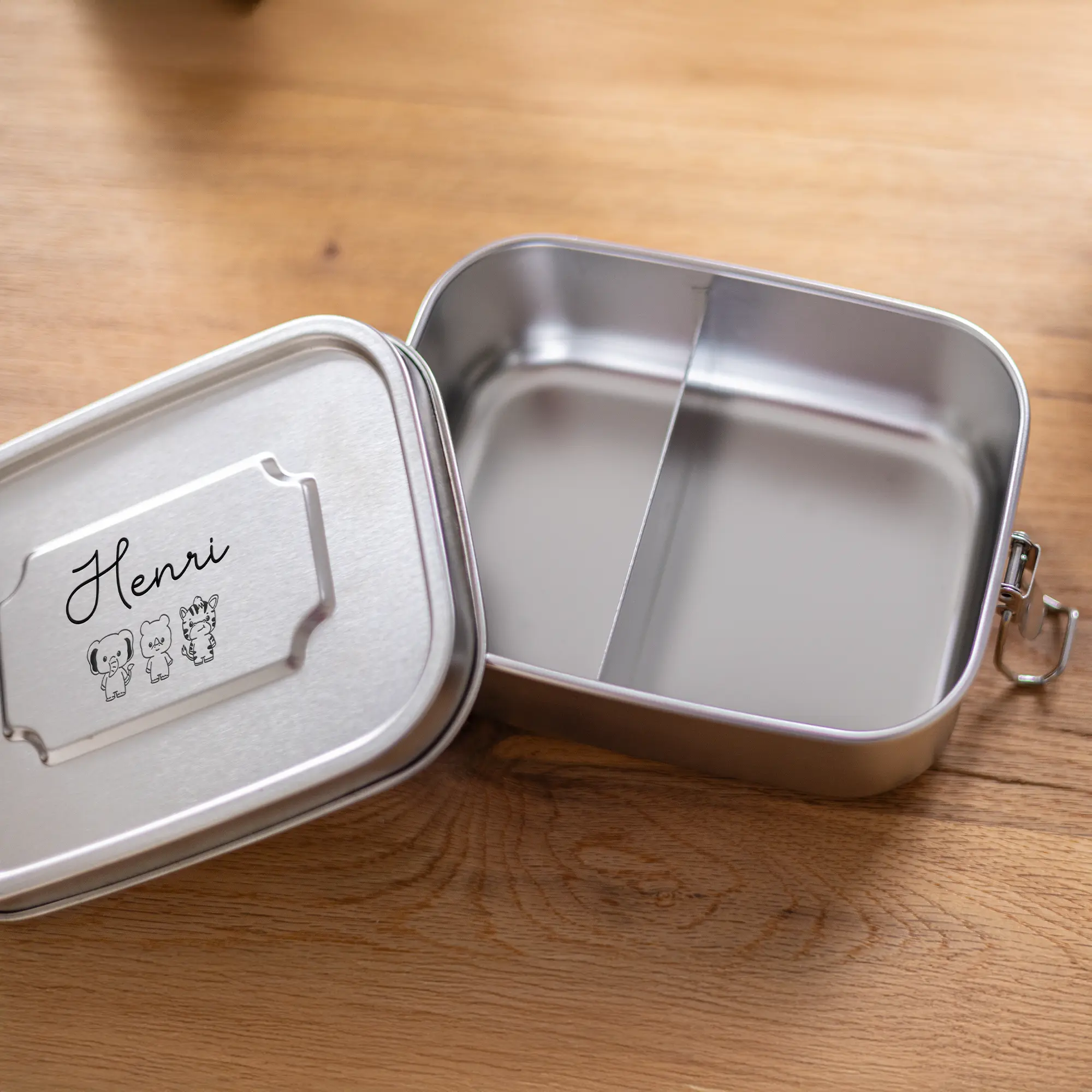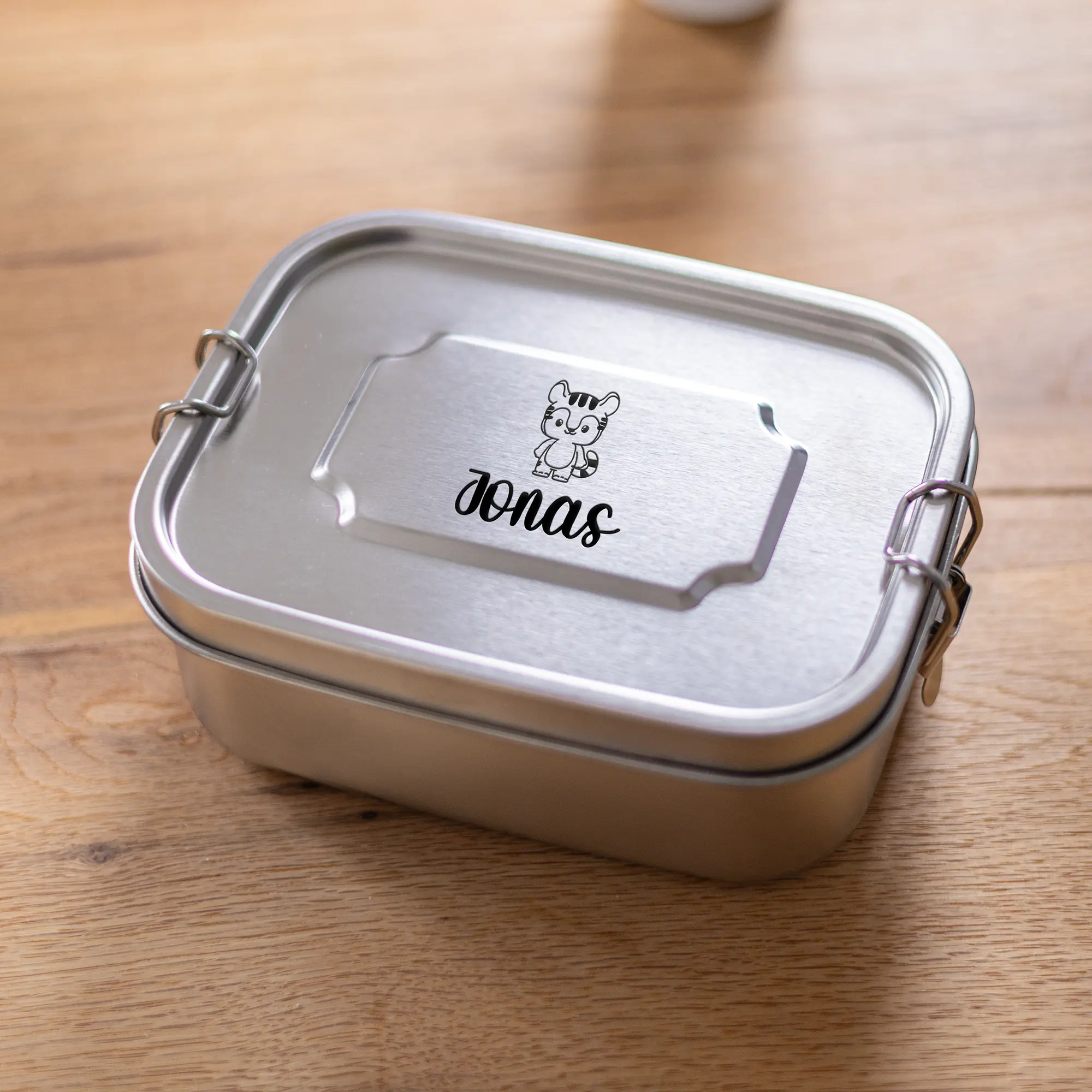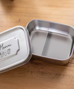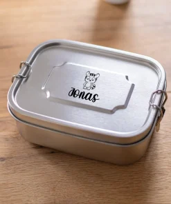 Unsere personalisierte Lunchbox aus Edelstahl für Kinder ist ein wunderbares Geschenk für angehende Schulkinder zur Einschulung, aber auch für Kindergartenkinder. Denn das niedliche Design mit dem Namen eurer Kinder zusammen mit den süßen Tiermotiven sind ein einfaches Design für jede Altersklasse – egal ob für Jungen oder Mädchen! Zudem ist die personalisierte Brotbox für Kinder mit einem Dichtungsring und einem einfachen aber dichten Verschluss perfekt um auch feuchte Mahlzeiten euren Kindern mit in die Schule, den Kindergarten oder auf Ausflügen zu geben. Die Namen eurer Kinder werden zusammen mit der von euch gewünschten Tiermotiven auf den Deckel der Lunchbox mittels präziser Lasergravur eingraviert. Hierbei bieten sich euch verschiedene Möglichkeiten der Positionierung des Motivs! Durch die saubere Gravur und dem Edelstahl erhaltet ihr eine Brotbox, welche eure Kinder noch sehr lange begleiten wird, also macht ihnen doch eine ganz besondere und vor allem persönliche Freude zur Einschulung, den ersten Kindergartentagen, oder einfach so!