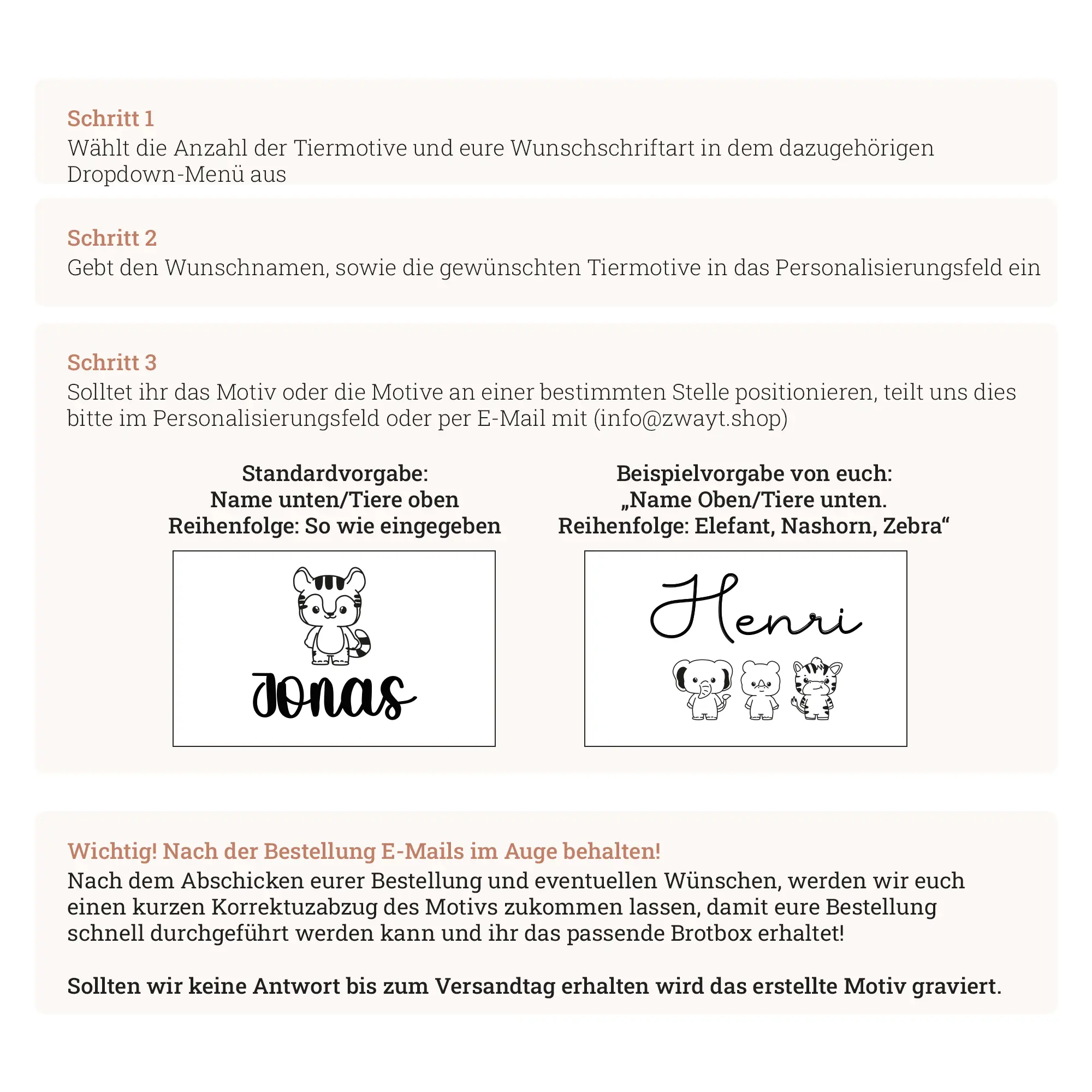 Wähle aus dreizehn verschiedenen Tiermotiven und 14 verschiedenen Schriftarten oder lasse bei besonderen Wünschen eure personalisierte Brotbox von uns umgestalten. Jede Lunchbox wird in sorgfältiger Handarbeit in Deutschland hergestellt und von uns weiterverarbeitet, wodurch jedes Stück zu einem Unikat wird. Die individuelle Maserung des Holzes und die präzise Lasergravur machen die Lineal zu einem besonderen Blickfang in jeder Situation.