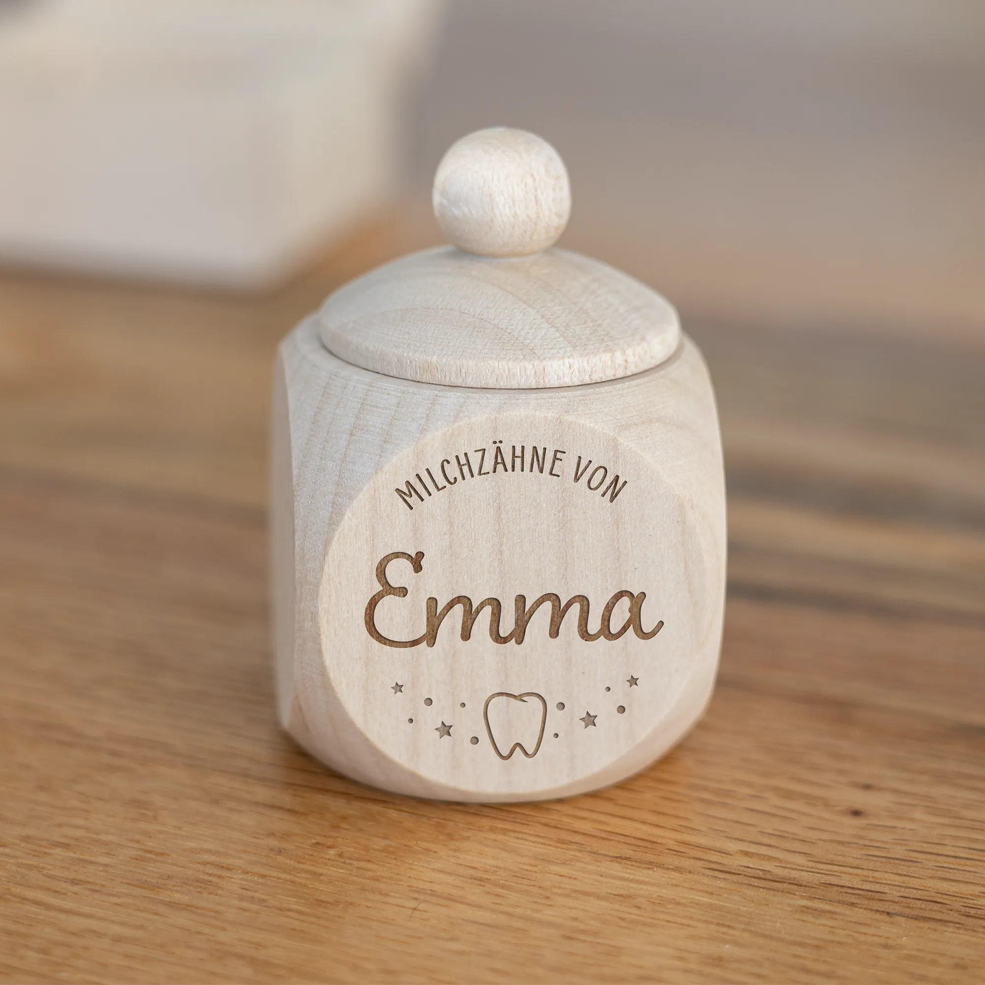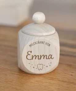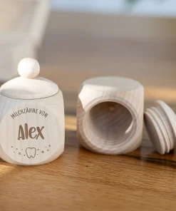 Die personalisierten Milchzahndosen für Kinder aus stabilem und naturbelassenem Buchenholz eignen sich perfekt für die Milchzähne eurer Kinder. Durch das schöne Holz könnt ihr alle Milchzähne, die von der Zahnfee eingesammelt wird sicher und für eine sehr lange Zeit in einer Dose mit niedlichem Motiv aufbewahren. Durch den einfachen Schraubverschluss kann die Dose schnell und einfach geöffnet und sicher wieder verschlossen werden, wodurch keine Milchzähne verloren gehen! Zudem habt ihr die Möglichkeit, die Namen eurer Kinder, Patenkinder oder auch Enkelkinder in einer von euch gewählten Schriftart zusammen mit einem filigranen Zahnmotiv und dem Schriftzug „Milchzähne von“ auf eine der 4 Seiten der Milchzahndose gravieren und damit ganz individuell gestalten zu lassen. Durch die klare Gravur und das edle Holz entsteht eine langlebige, aber auch schöne Milchzahndose, welche euch und eure Kinder begleitet, während die Zahnfee Zahn für Zahn von euren Kindern an sich nimmt. Auch perfekt als kleines Geschenk für Eltern, deren Kind die ersten Milchzähne verliert, oder als kleines Geschenk zur Geburt!