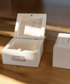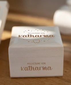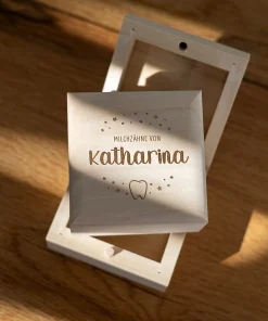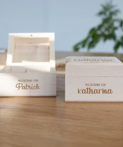 Zudem habt ihr die Möglichkeit, die Namen eurer Kinder, Patenkinder oder auch Enkelkinder in einer von euch gewählten Schriftart zusammen mit einem filigranen Zahnmotiv und dem Schriftzug „Milchzähne von“ auf der oberen Seite der Milchzahndose gravieren und damit ganz individuell gestalten zu lassen. Zudem habt ihr noch die Option die Vorderseite der kleinen Milchzahndose zusätzlich mit dem Namen eurer Kinder personalisieren zu lassen. Durch die klare Gravur und das edle Holz entsteht eine langlebige, aber auch schöne Milchzahndose, welche euch und eure Kinder begleitet, während die Zahnfee Zahn für Zahn von euren Kindern an sich nimmt. Auch perfekt als kleines Geschenk für Eltern, deren Kind die ersten Milchzähne verliert, oder als kleines Geschenk zur Geburt!