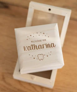 Zudem habt ihr die Möglichkeit, die Namen eurer Kinder, Patenkinder oder auch Enkelkinder in einer von euch gewählten Schriftart zusammen mit einem filigranen Zahnmotiv und dem Schriftzug „Milchzähne von“ auf der oberen Seite der Milchzahndose gravieren und damit ganz individuell gestalten zu lassen. Zudem habt ihr noch die Option die Vorderseite der kleinen Milchzahndose zusätzlich mit dem Namen eurer Kinder personalisieren zu lassen. Durch die klare Gravur und das edle Holz entsteht eine langlebige, aber auch schöne Milchzahndose, welche euch und eure Kinder begleitet, während die Zahnfee Zahn für Zahn von euren Kindern an sich nimmt. Auch perfekt als kleines Geschenk für Eltern, deren Kind die ersten Milchzähne verliert, oder als kleines Geschenk zur Geburt!