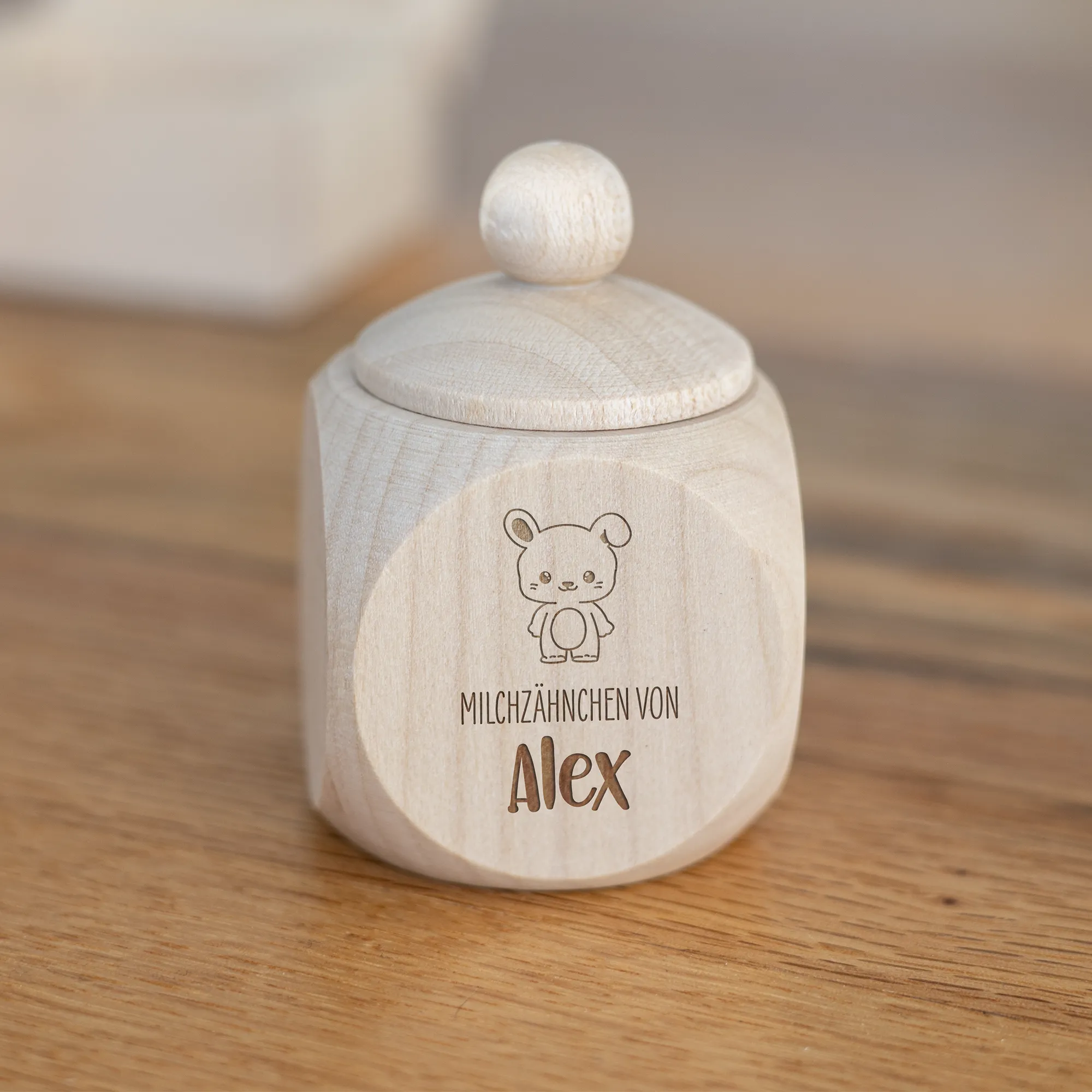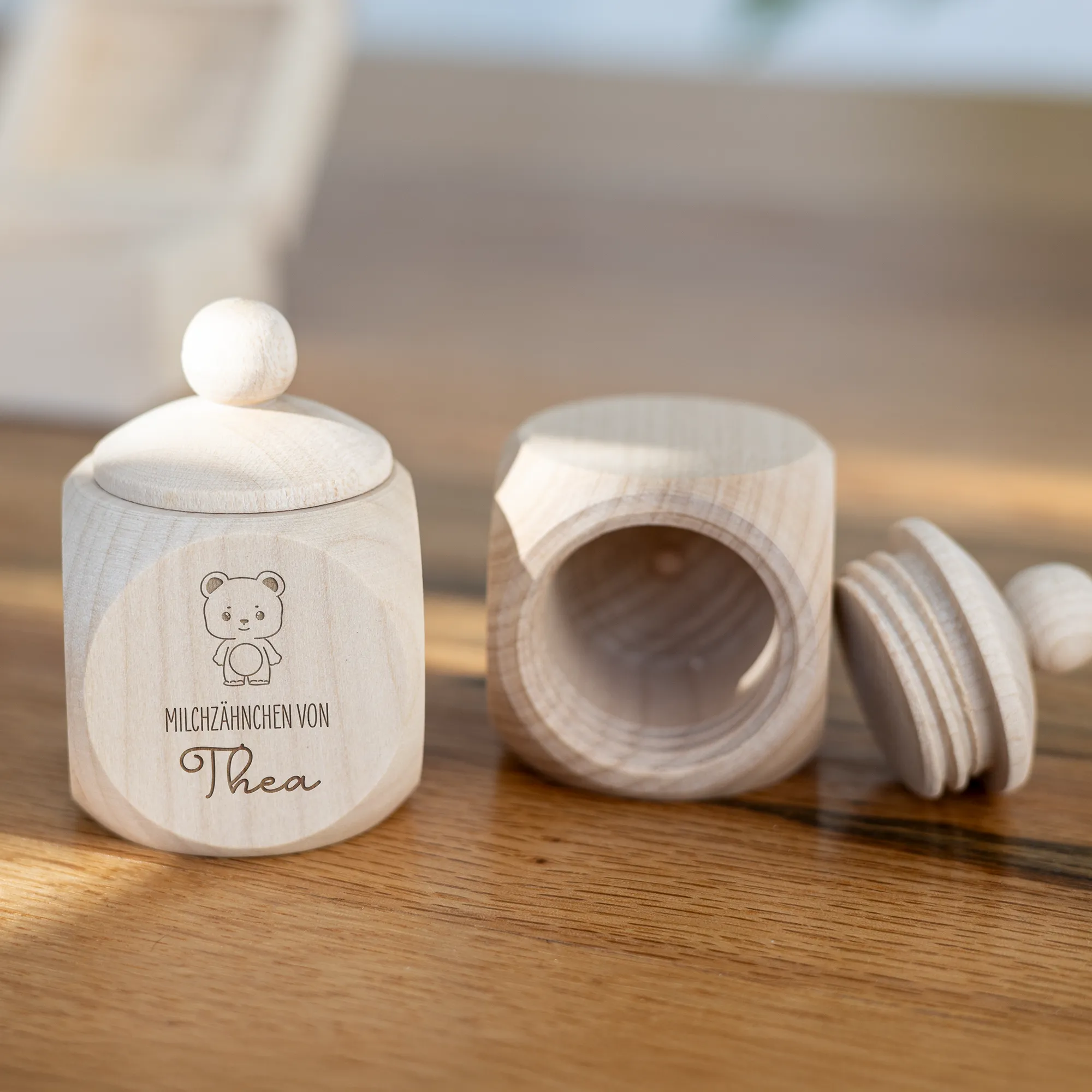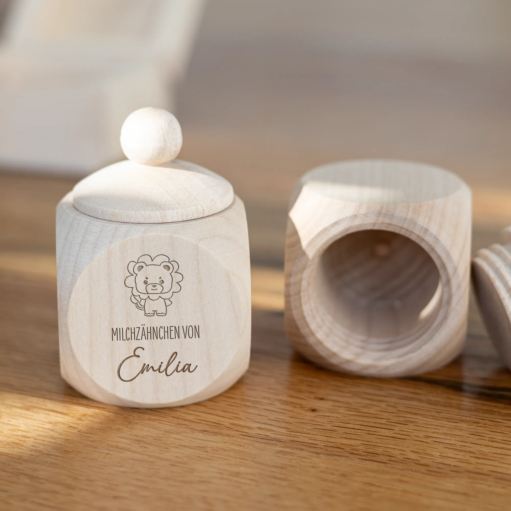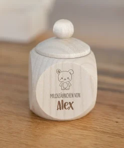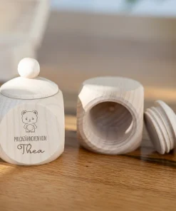Die personalisierten Milchzahndosen für Kinder aus stabilem und naturbelassenem Buchenholz eignen sich perfekt für die Milchzähne eurer Kinder. Durch das schöne Holz könnt ihr alle Milchzähne, die von der Zahnfee eingesammelt wird sicher und für eine sehr lange Zeit in einer Dose mit niedlichem Motiv aufbewahren. Durch den einfachen Schraubverschluss kann die Dose schnell und einfach geöffnet und sicher wieder verschlossen werden, wodurch keine Milchzähne verloren gehen! Zudem habt ihr die Möglichkeit, die Namen eurer Kinder, Patenkinder oder auch Enkelkinder in einer von euch gewählten Schriftart zusammen mit einem filigranen Zahnmotiv und dem Schriftzug „Milchzähne von“ auf eine der 4 Seiten der Milchzahndose gravieren und damit ganz individuell gestalten zu lassen. Durch die klare Gravur und das edle Holz entsteht eine langlebige, aber auch schöne Milchzahndose, welche euch und eure Kinder begleitet, während die Zahnfee Zahn für Zahn von euren Kindern an sich nimmt. Auch perfekt als kleines Geschenk für Eltern, deren Kind die ersten Milchzähne verliert, oder als kleines Geschenk zur Geburt!