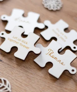 Verschenkt zu Valentinstag oder Hochzeitstag personalisierte Puzzleteile, die mit euren Wunschnamen und Texten graviert werden können. Die Teile lassen sich beliebig kombinieren und auch beidseitig gestalten. Mit einem optionalen Loch können die Puzzleteile zudem als Anhänger verwendet werden.